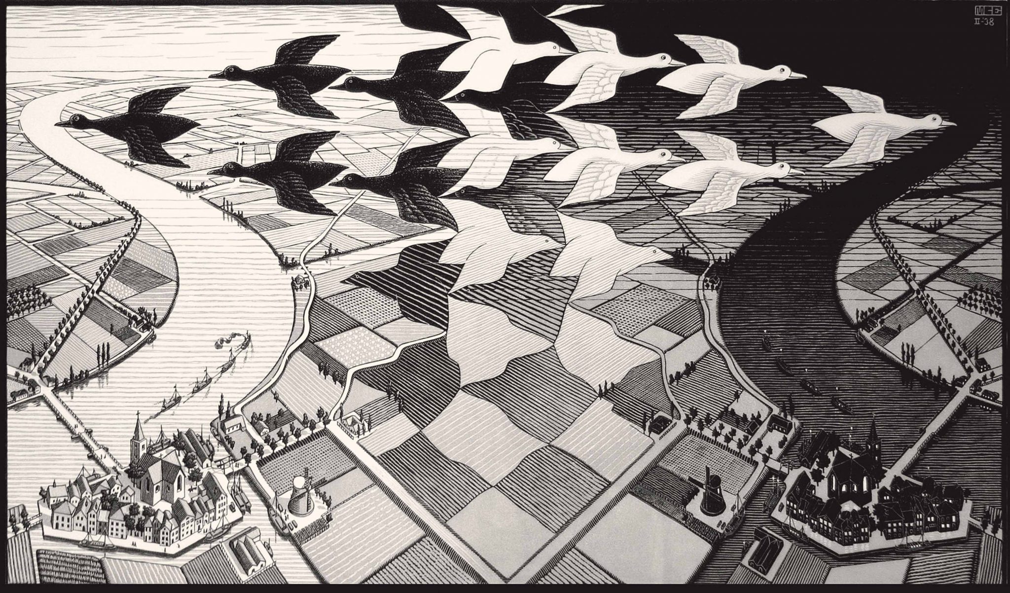 Maurits Cornelis Escher Día y noche 1938 Xilografía, 39,1×67,7 cm The Escher Foundation Collection All M.C. Escher works © 2017 The M.C. Escher Company. All rights reserved www.mcescher.com