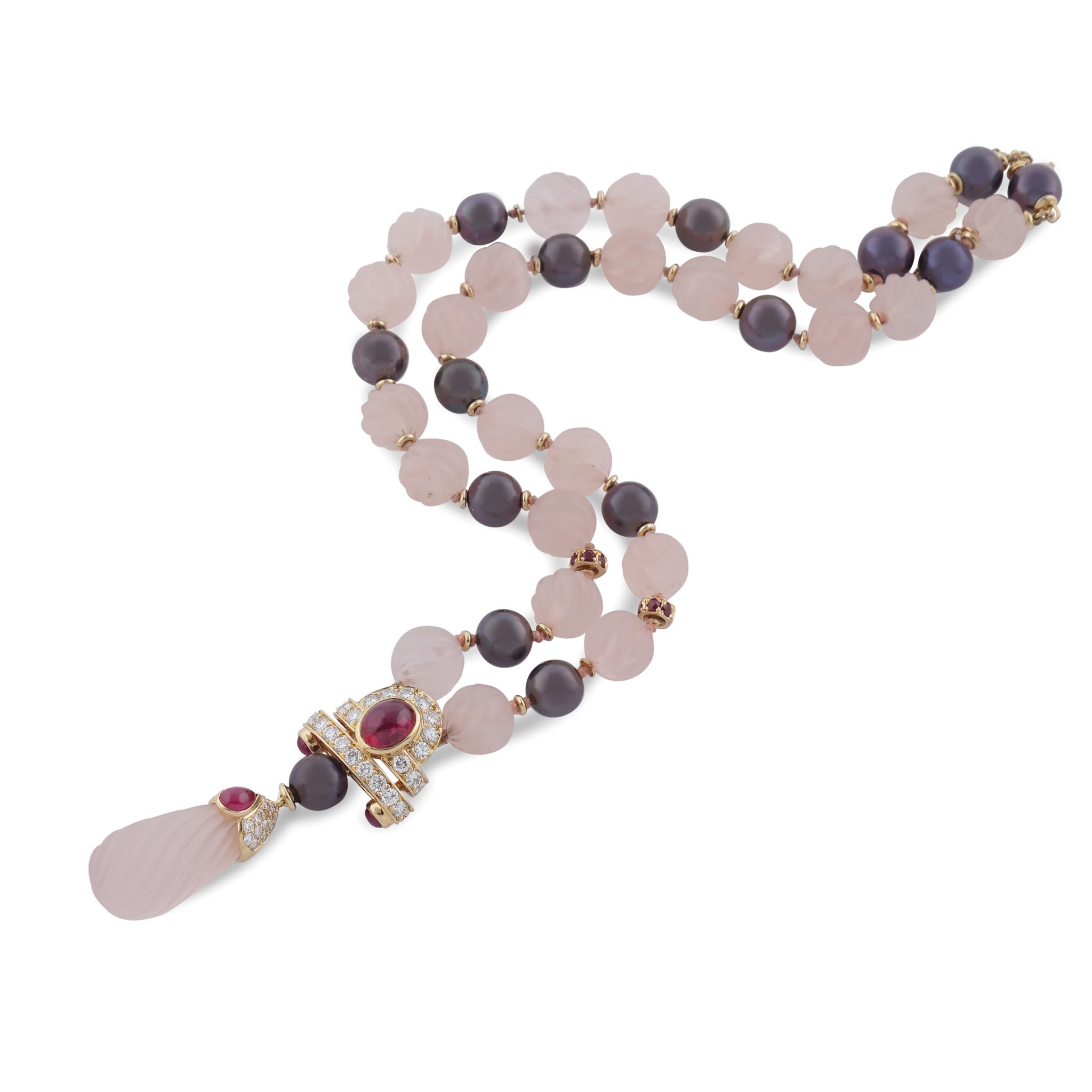 Da Bulgari a Buccellati. Spiccano in questo caso due anelli degli anni 40/50 ai lotti 338 e 339 (€ 5.000-8.000). Per chi ama il quarzo rosa da non perdere il collier di Boucheron (lotto 318, € 5.500-6.500) formato, appunto, da sfere in quarzo rosa intagliato alternate da piccole maglie in oro giallo e perle Tahiti con pendente centrale in oro giallo composto da un quarzo rosa a goccia, sormontato da rubini taglio cabochon e diamanti taglio brillante.