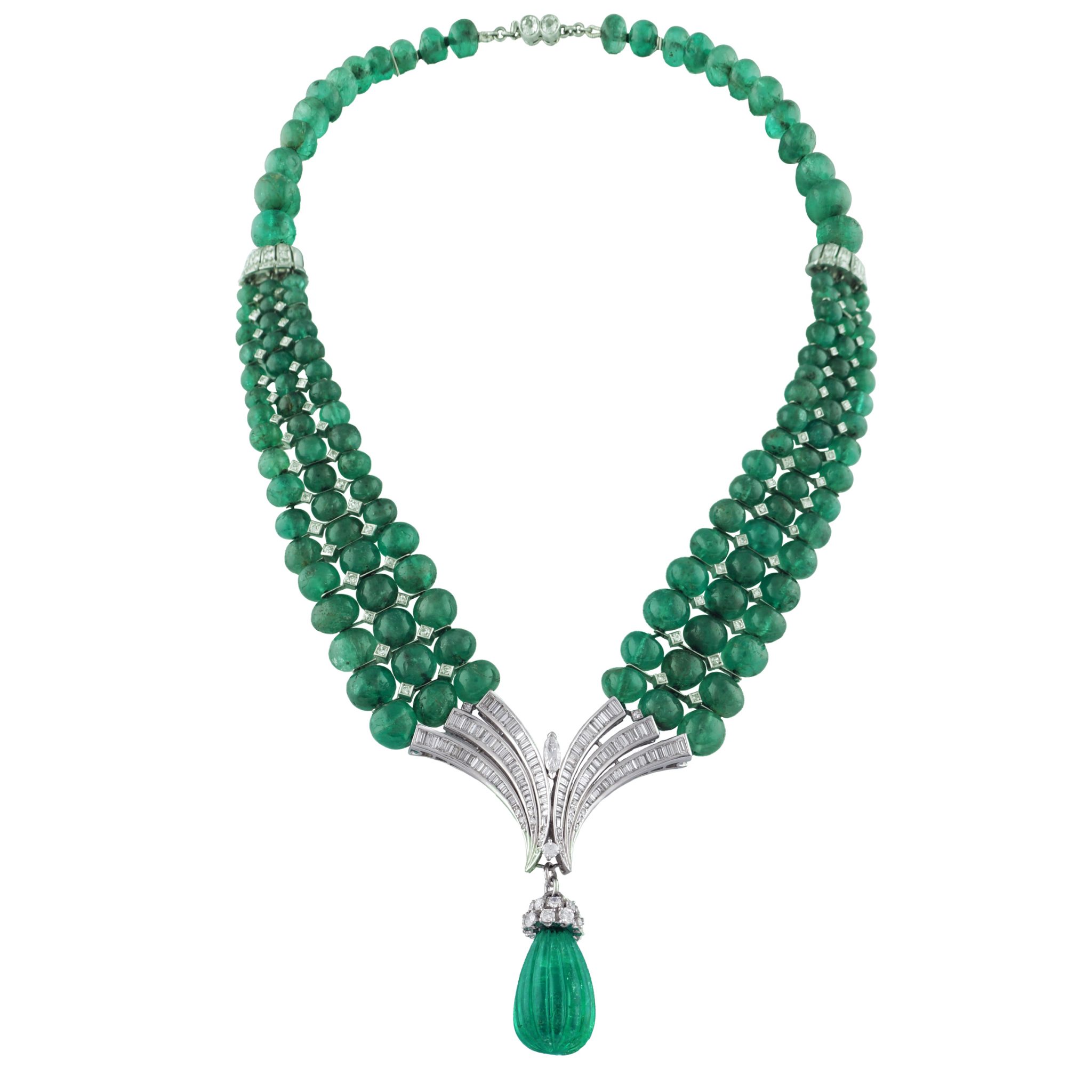 Si accendono i riflettori sul lotto 330, uno splendido collier in platino e smeraldi firmato Mauboussin (€ 15.000-18.000). Si tratta di tre fili di 126 smeraldi taglio boules disposti a gradazione alternati da elementi rettangolari e diamanti taglio brillante, due fermezze laterali con diamanti taglio brillante e centrale in platino con smeraldo pendente a goccia baccellato sormontato da diamanti taglio baguettes, brillante e marquise, chiusura in platino e diamanti taglio brillante.
