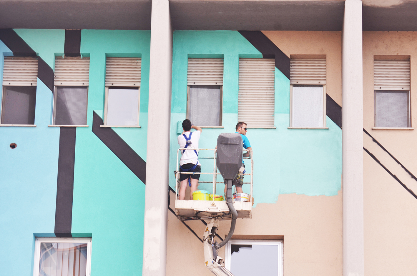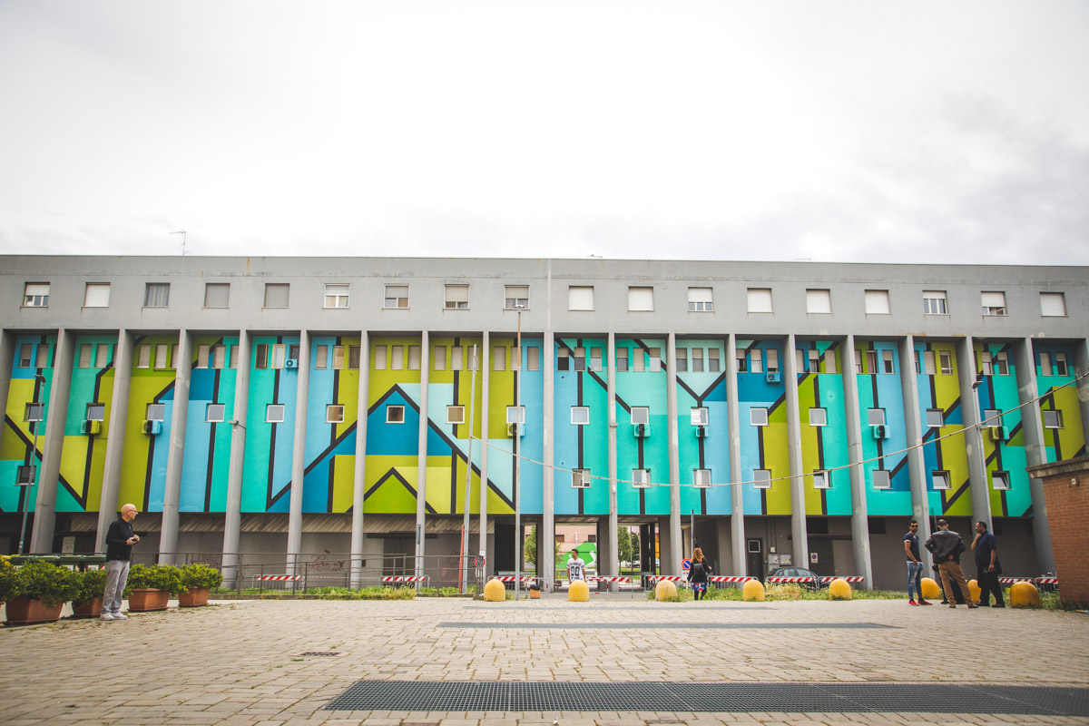 I colori assumono un ruolo fondamentale nel lavoro di JOYS: il turchese bacia il cielo e il verde dialoga con la vegetazione sottostante creando un continuum con gli elementi naturali che circondano il palazzo. Le linee che compongono forme geometriche, tipiche del suo stile, sono marcate dal colore nero e si inseriscono in maniera armonica all’interno dell’architettura dell’edificio.