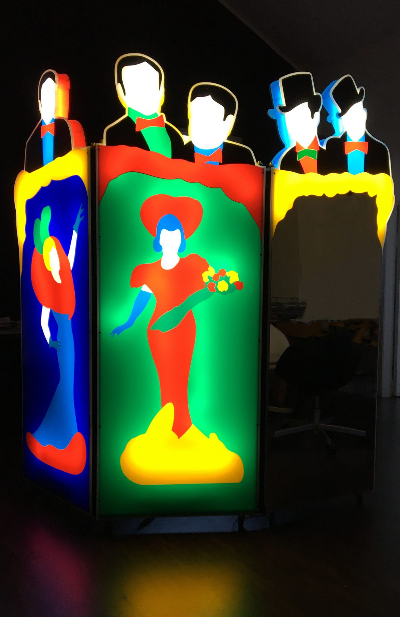 Seppure provenienti da formazioni diverse i lavori di Marco Lodola e Giovanna Fra creano un profondo dialogo e si completano vicendevolmente, ma soprattutto instaurano un forte legame con il luogo che li ospita. Il dialogo con stucchi, decorazioni, pitture di genere e con un’architettura di inestimabile pregio costituisce una sfida ardua ma affascinante per gli artisti. Il risultato del loro lavoro è un cortocircuito visivo tra tempus e time, una passeggiata nel passato, che scopriamo essere sorprendentemente vicino al nostro presente.