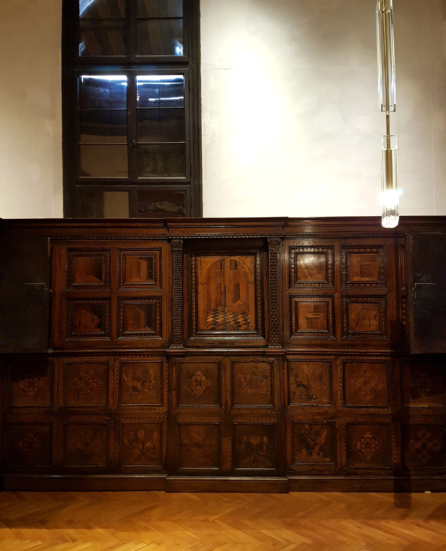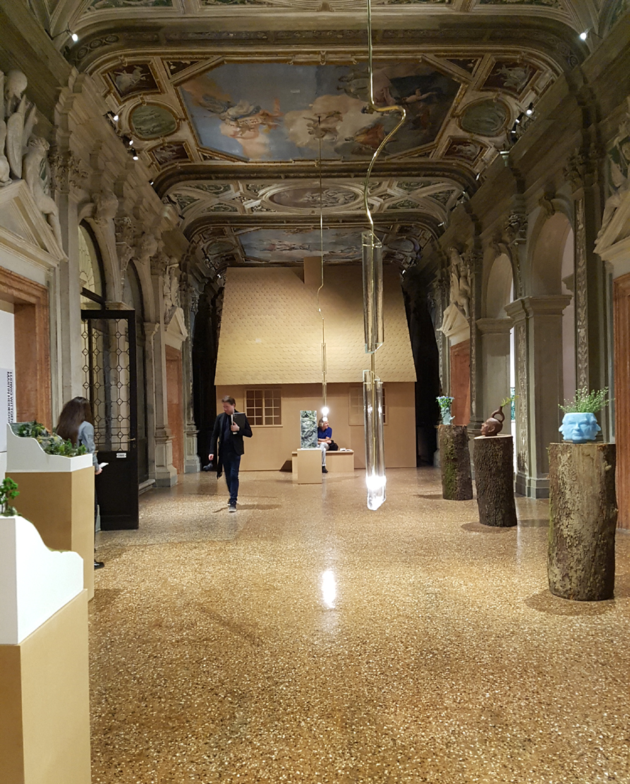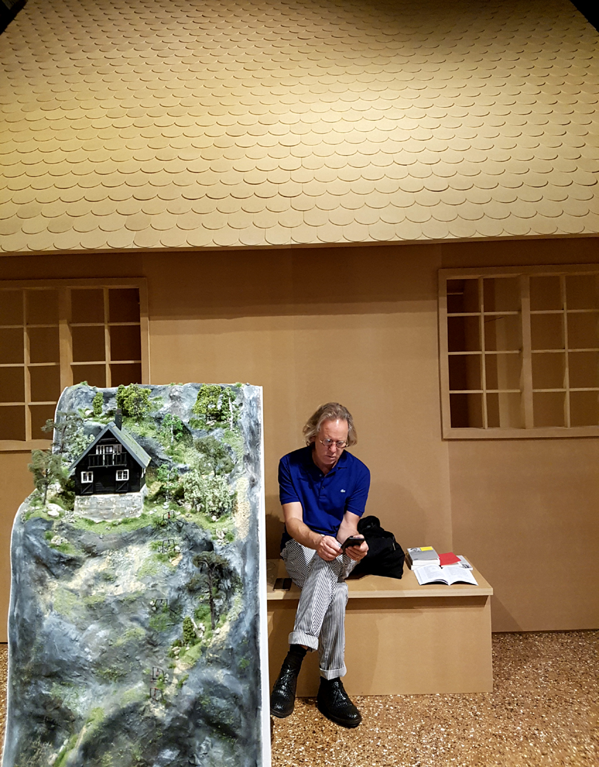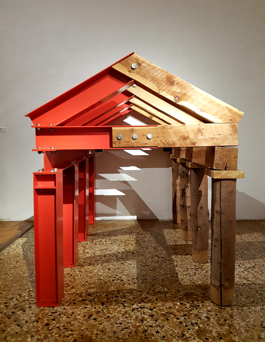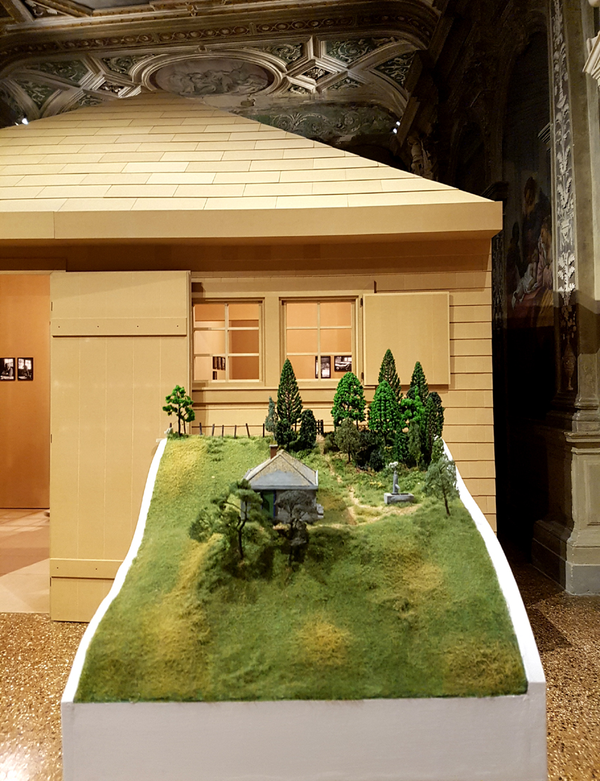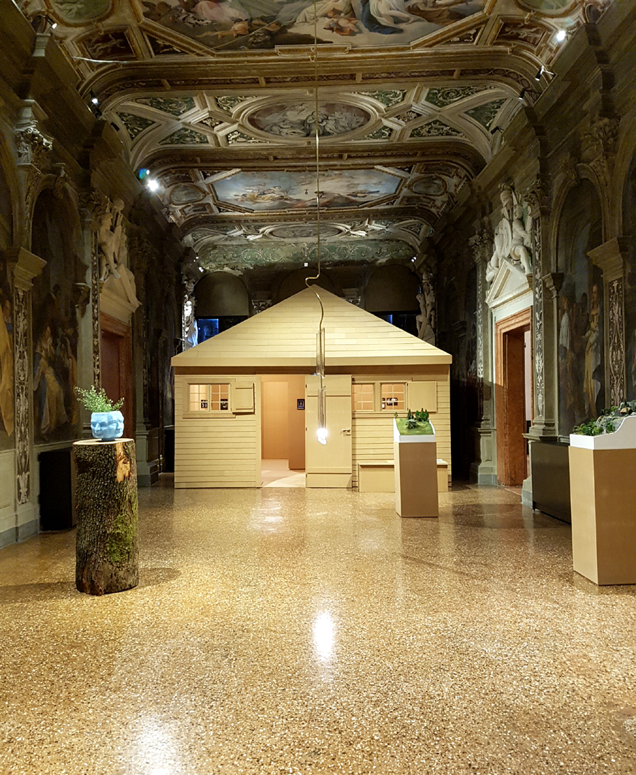 Seguendo queste riflessioni l’artista e poeta scozzese Ian Hamilton Finlay ha realizzato nel 1987 Adorno’s Hut, un’installazione centrale all’interno della mostra insieme alle ricostruzioni architettoniche dei luoghi di ritiro nei quali Heidegger e Wittgenstein scrissero le loro rispettive opere fondamentali “Essere e Tempo” (1927) e “Tractatus Logico-Philosophicus” (1921). Esposte negli spazi di Ca’ Corner della Regina, queste riproduzioni accolgono a loro volta documenti e opere che trattano il tema dell’archetipo architettonico della capanna come luogo di fuga e di ritiro.