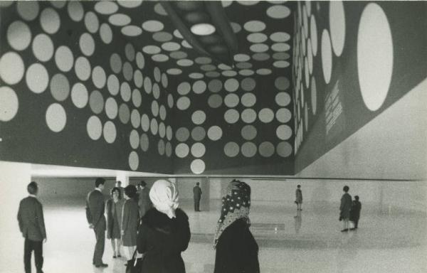 Celebre la soluzione trovata da Achille Castiglioni, con l’aiuto del fratello Pier Giacomo e dell’amico e grafico svizzero Max Huber, per il padiglione della Montecatini in occasione della mostra Chimica = undomani + sicuro, presentata alla fiera di Milano del 1967. Partendo da un’apparente limitazione imposta dallo spazio espositivo, che si estendeva verso l’alto a discapito dello dimensione orizzontale, il gruppo trova un espediente capace di sorprendere e affascinare. I soffitti vengono infatti abbassati fino ad un’altezza di circa 2,20 metri al fine di costringere il visitatore in una condizione di disorientamento spaziale e visivo. Il contenuto dell’esposizione appariva solo nelle sezioni localmente sfondate verso l’alto, costringendo lo spettatore, proprio come al cinema, al ruolo attivo e partecipativo di alzare lo sguardo al contenuto e al futuro a cui la società (ma anche Castiglioni) voleva indirizzarsi.
