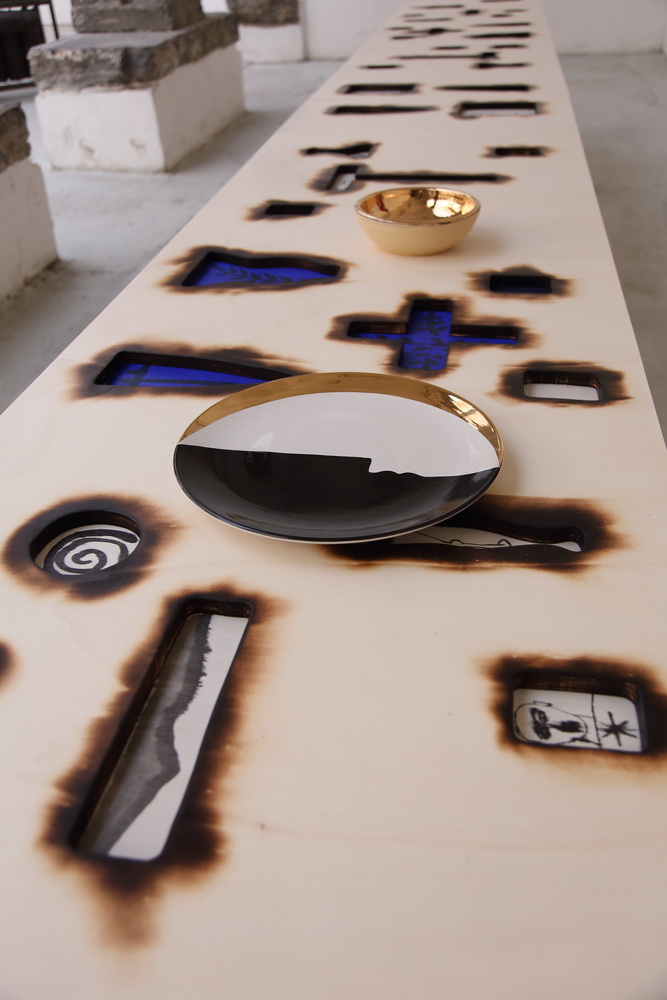 Nel mezzo di queste figure, nel numero simbolico di 12, ciotole e pani. E poi oggetti di uso quotidiano, distribuiti in un disordine sparso e vissuto, come di un pasto fra amici, come la fine del pranzo della festa.