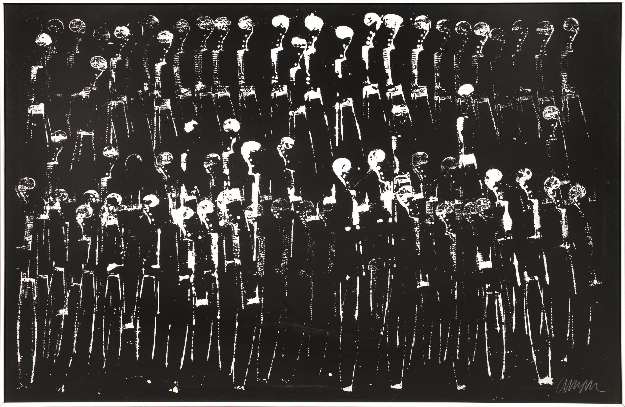 Tra i 164 lotti in catalogo si segnala un’opera di Nicola De Maria, Giorno del secolo nuovo di grandissime dimensioni, cm 157×342, eseguita nel 1980 inserita in catalogo con la stima di 35.000/60.000 euro (lotto 107) e una rara opera di Fernandez Arman del 1961 intitolata Violini che è stata stimata 20.000/40.000 euro (lotto 31).