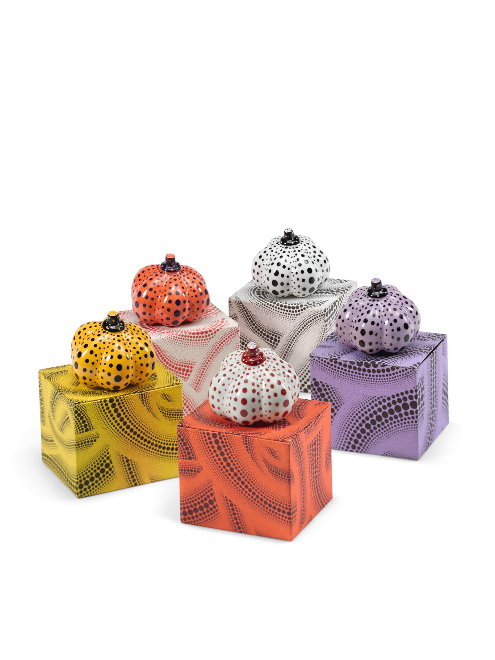 Infine, “cover” della collezione è il gruppo di “zucchette” colorate di Yayoi Kusama datate 2002, simbolo stesso dell’artista. L’opera “Pumpkins” si compone di 5 elementi in resina dipinta e scatole di cartone (est. € 12.000 – € 18.000).