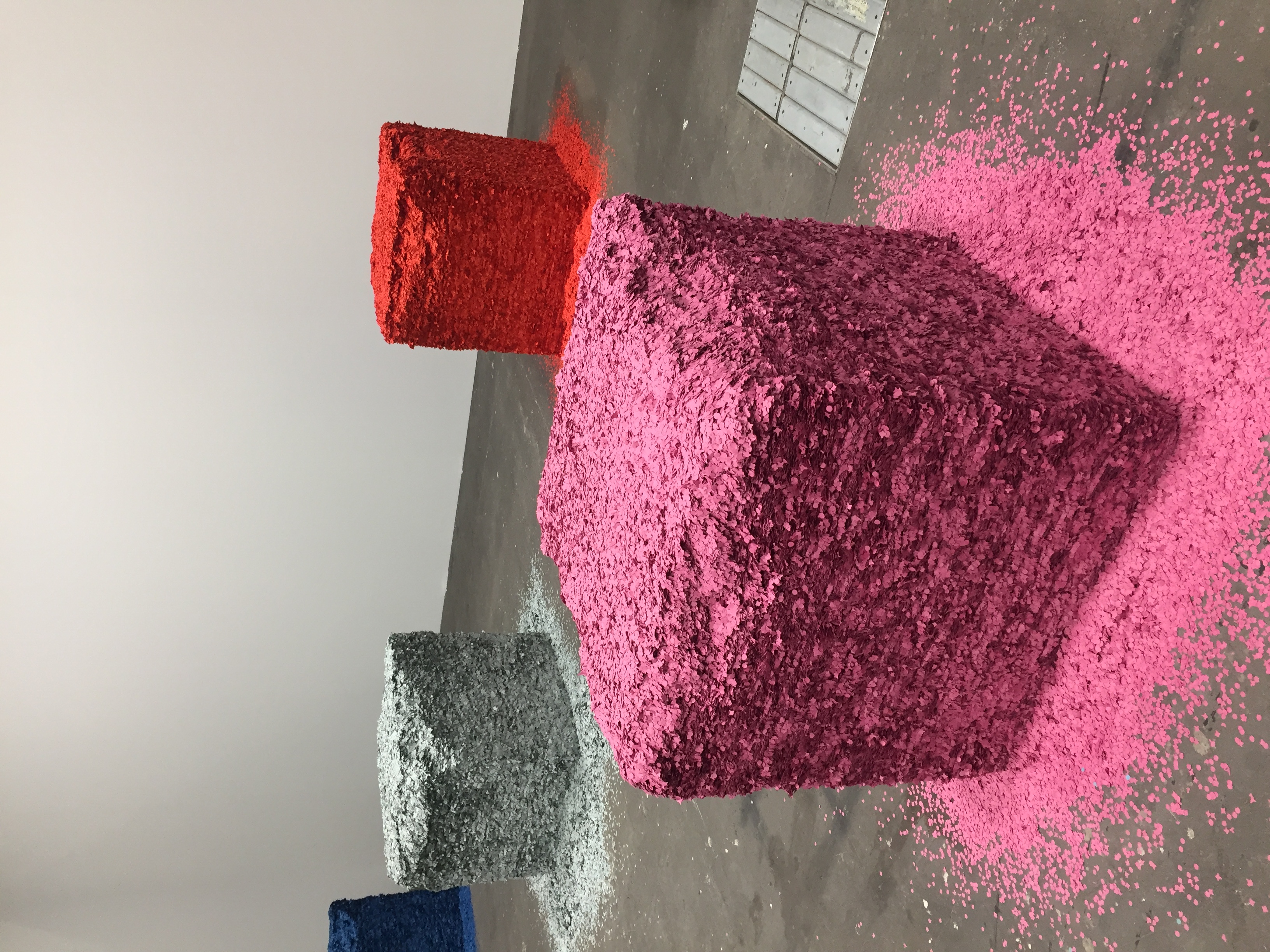 L’effimero e la transitorietà dei coriandoli compressi nella purezza e nella compostezza della forma cubica. Cubi, forme perfette ed imperiture rese vulnerabili dall’estrema volatilità del materiale. Lara Favaretto (Treviso, 1973), portata in fiera dalla Galleria Franco Noero, ci immerge in un trionfo di colori ispirati al film Birdman (2014) di Alejandro González Iñárritu che agli Oscar del 2014 ne ha vinti ben quattro.