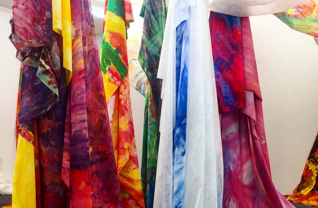 Trenta teli dipinti che invadono un’intera stanza e dividono lo spazio in una serie di volumi simili a labirinti. Impossibile non rimanere incantati dall’opera di Sam Gilliam (U.S.A. 1933) portata da David Kordansky. All’artista è anche dedicata una retrospettiva al Kunstmuseum di Basilea dal titolo The music of color.