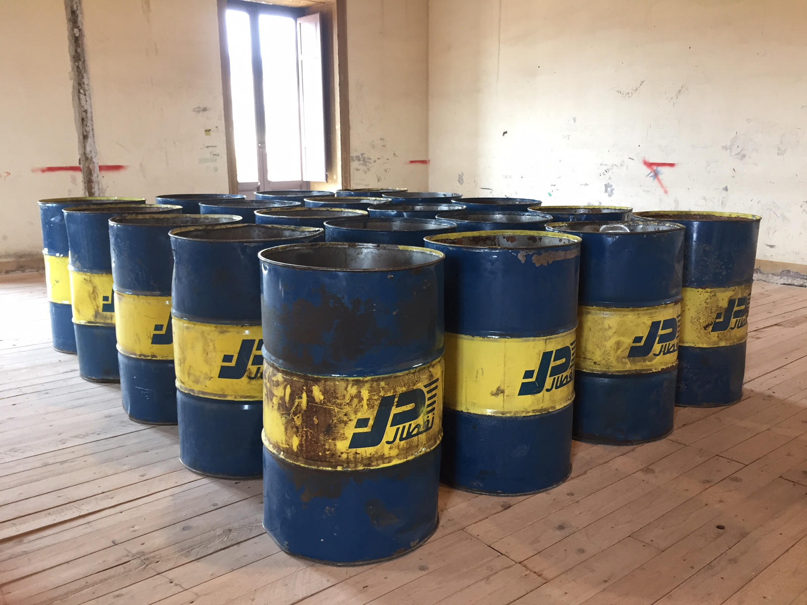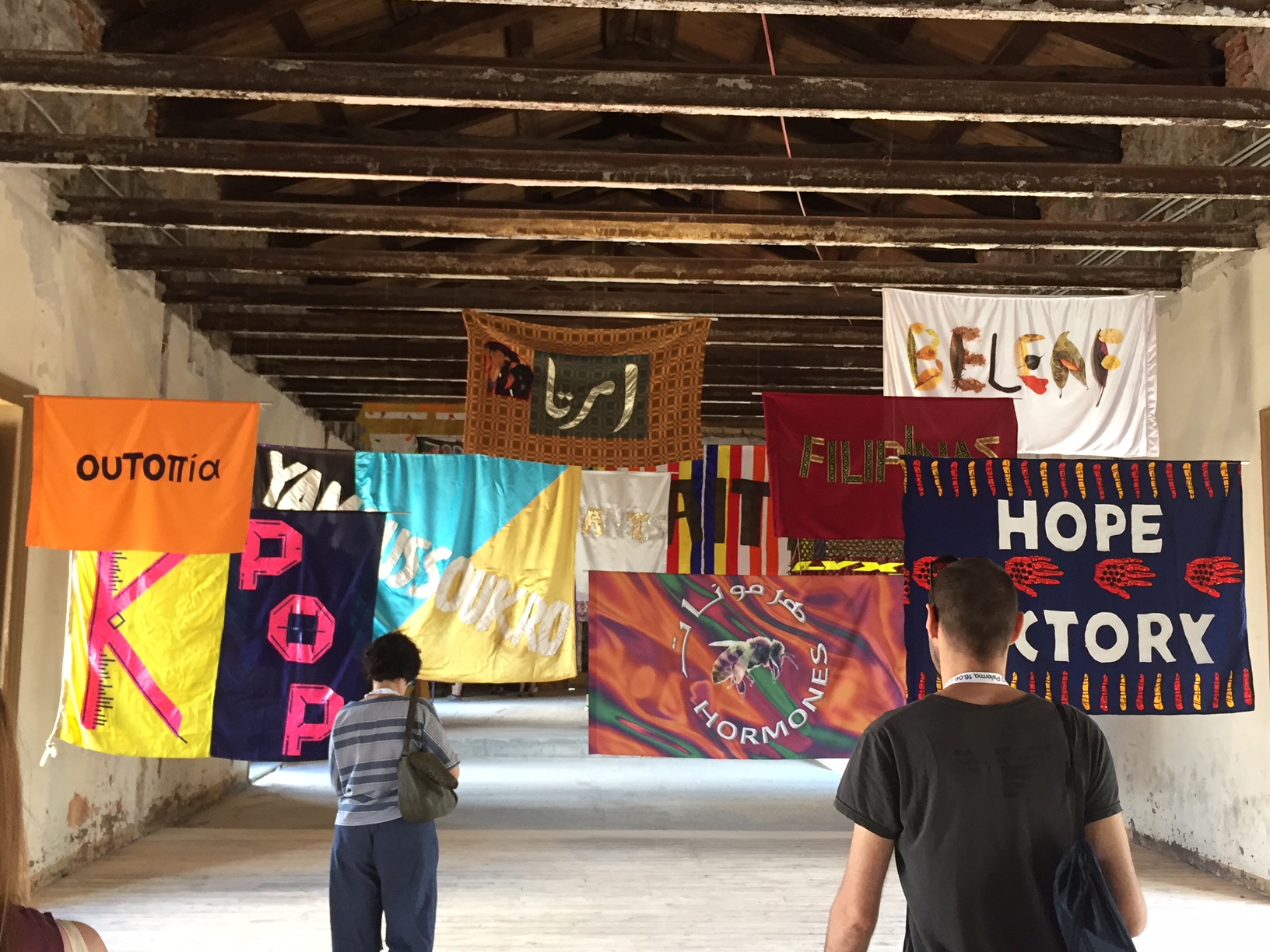 Lunghe teorie di bandiere dei luoghi che hanno ospitato un progetto “partecipato”. Un’installazione creata con barili di petrolio algerino, un’altra che con una sfilza di cerchi metallici ammicca a un oleodotto, e poi un murale con un “oppresso” che tenta di liberarsi da una rete metallica. Cambia sede, ed ecco la più classica delle periferie degradate, con un’installazione fatta dai detriti e pattume raccolto su una spiaggia. Altro scenario, e c’è l’artista cinese che risolve radicalmente il tema di “coltivare la coesistenza”, proponendo il tema “eco-queer”: sette giovani – citiamo testualmente dal catalogo – stabiliscono “un contatto intimo con delle felci”, ovvero “fanno l’amore con le piante”. Rivoluzionario, se non fossero passati 26 anni da quando Paul McCarthy scioccava su simili tenori con il suo “The Garden”.