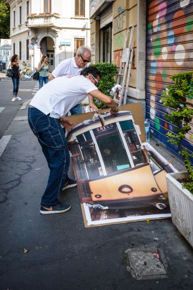 Hanno scelto il tram, uno dei soggetti ricorrenti nella fervida creatività dei tre autori e in questo caso non poteva essere che il mitico 33, una delle storiche vetture dell’ATM con le classiche sedute in legno che attraversa proprio l’Isola e fa capolinea in Piazzale Lagosta.