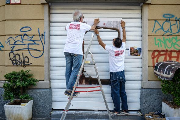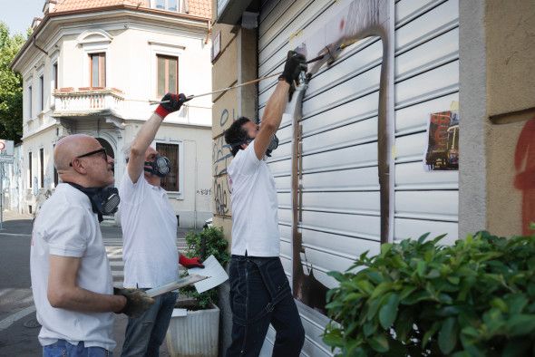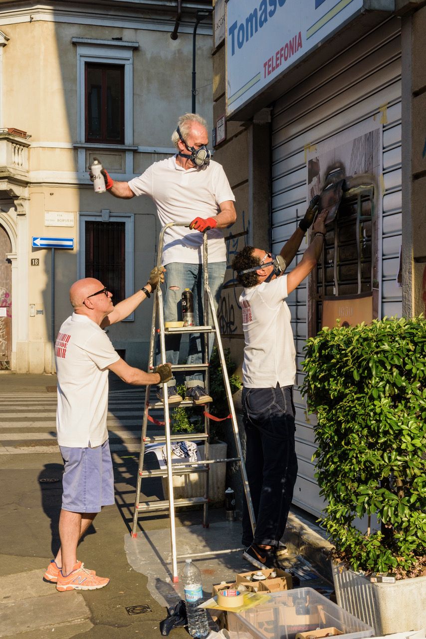 Per la prima volta Stefano Albertini, Luciano Bobba e Max Portale, i tre esponenti di un’inedita arte democratica contemporanea che padroneggia da anni, con un virtuosismo sorprendente, décollage, découpage, stencil, pittura a spruzzo, acrilici e serigrafie, hanno trasformato la saracinesca di Tomasello, un negozio storico di Piazza Minniti, all’angolo con via Jacopo dal Verme, in un’opera d’arte dai colori accesi e vivaci.