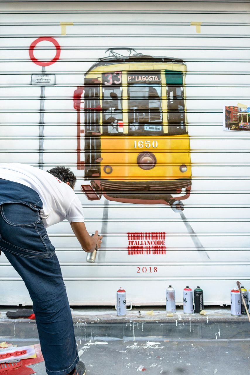 “È la nostra prima performance in un luogo pubblico. Certo il soggetto è un tram anche perché ITALIANCODE, il nostro gruppo fondato quattro anni fa, come primo step artistico, si è ispirato alle classiche mappe di Milano e le ha trasformate in piccole opere artistiche dipingendo i monumenti e le piazze più note della città proprio sulle cartine. Il tram è quindi una nostra icona che si è sviluppata anche su tele di piccole e grandi dimensioni. ITALIANCODE attinge step by step dalla propria fantasia e dal proprio estro e questo ha generato varie esposizioni come Stencil Pop o Rotella Ricodificato alla Galleria DadaEast in via Varese 12 a Milano con una doppia chiave di lettura, la nostra e quella di Maurizio Galimberti. Senza dimenticare l’esposizione Stat rosa pristine nomine durante la festa di Shavuòt alla Sinagoga di Casale Monferrato dove il tema dominante è stata la rosa ”.