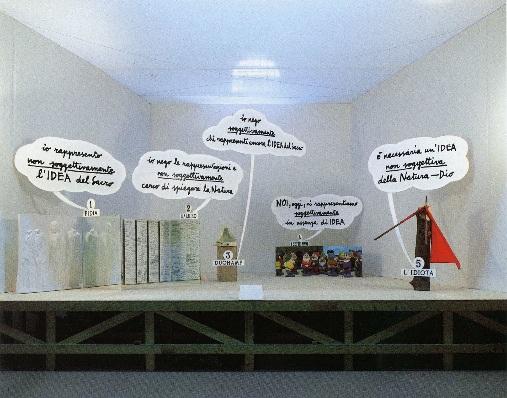 Enzo Mari, Dialogo tra Fidia, Galileo, Duchamp, i sette Nani, l’Idiota, 1986, Installazione polimaterica di 23 pezzi