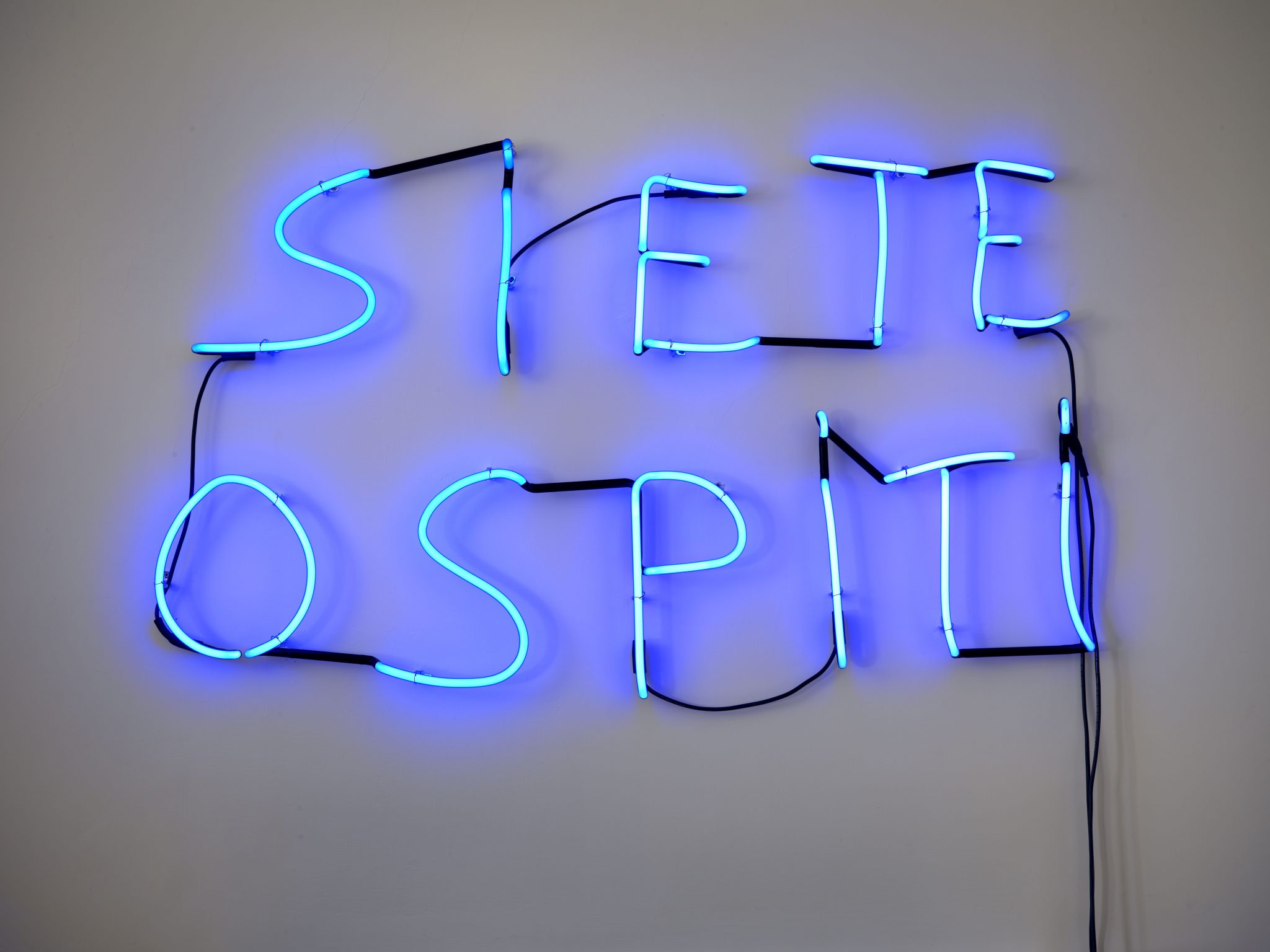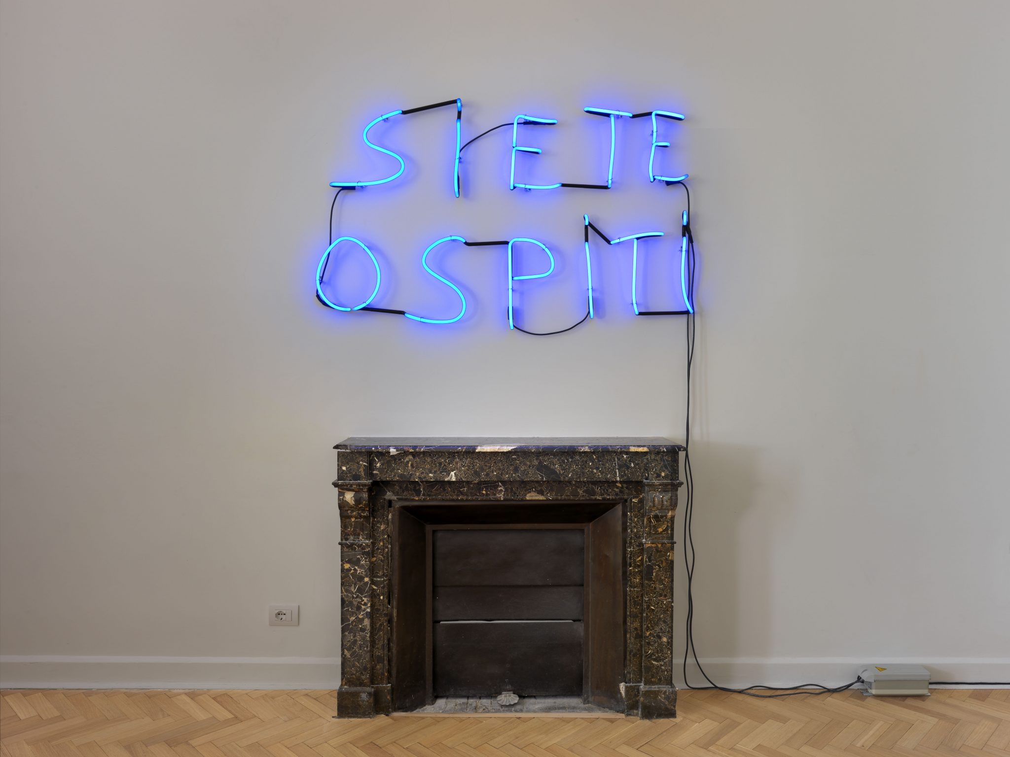 E’ un percorso espositivo che si sviluppa in senso antiorario, ad accogliere i visitatori la scritta in neon “Siete ospiti”, riproduce a grandi lettere blu, uno striscione esposto da un tifoso del calcio Napoli, durante la partita contro il Bologna, nota alle cronache per gli insulti razzisti nei confronti dei partenopei.