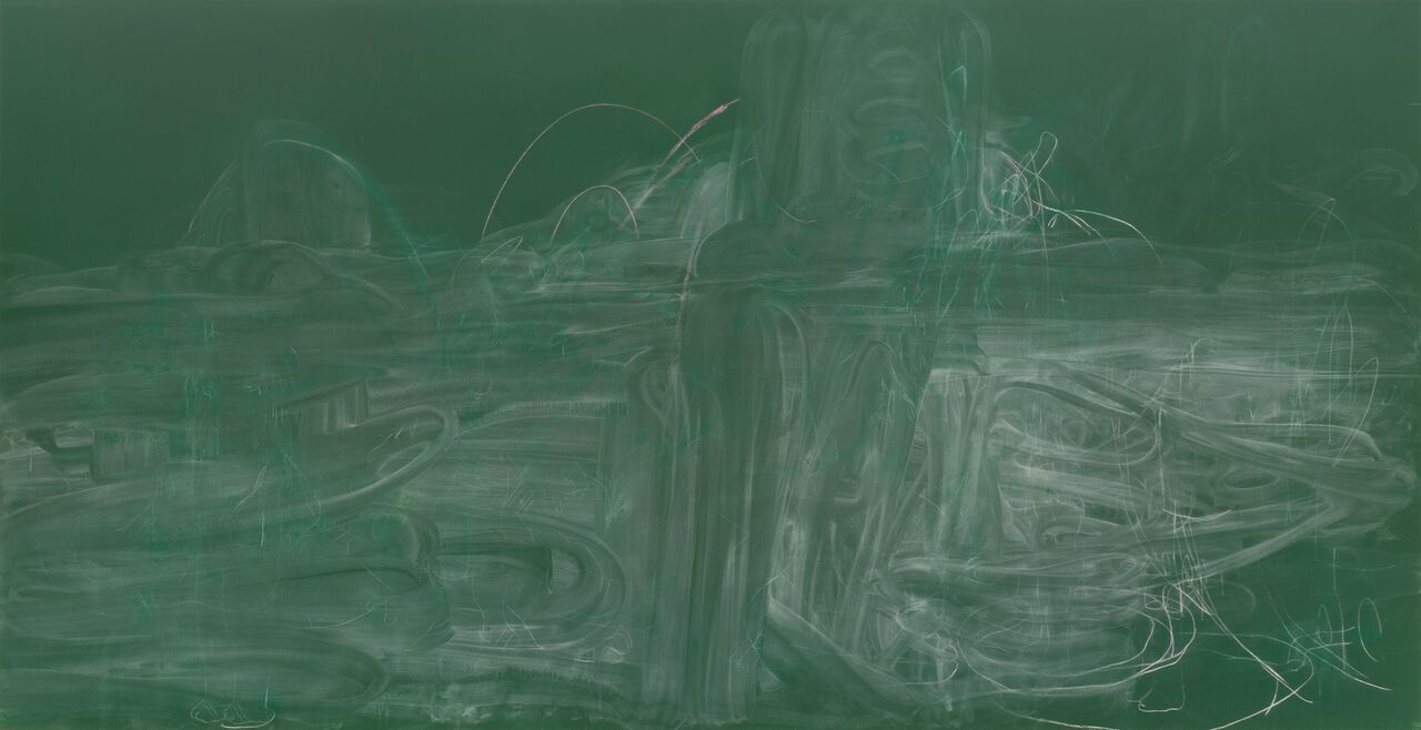 L’atto di addizione creativa trasforma il ricordo in storia, modella il sentimento in forma. Ma se così facendo ne inquadra il contesto, sembra allo stesso tempo cambiare caratteristiche alla sua natura di visione estemporanea, suggerimento di una voce senza labbra. Allora lavagna e gessetto trovano il terzo apice del triangolo, che si chiude e raccorda i due elementi tramite un successivo processo di sottrazione. Grazie ad una spugna Rita Ackermann cancella, talvolta in parte, talvolta quasi totalmente, le figure precedentemente disegnate. Il gesso, che perfettamente si presta all’opera, si scioglie in una coda di imprevedibili sfumature, solo parzialmente controllabili dall’artista. Proprio come i ricordi che animano quelli che lei stessa chiama “paesaggi interiori”. Le forme si articolano allora in movimenti fluidi ma disconnessi, come ricordi ed esperienze che senza chiedere si fanno monumento costitutivo della nostra persona.