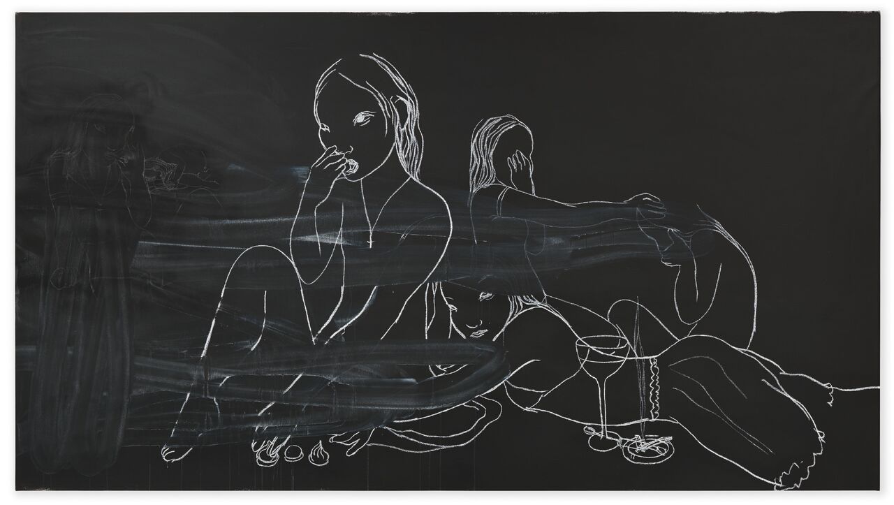 Da squarci nella tela mnemonica Rita Ackermann ricava lavagne pittoriche di medie e grandi dimensioni. Solidi supporti per eteree figure che sfumano nel momento in cui nascono, o forse proprio esistono in virtù della loro indeterminatezza. Un gruppo di ragazzine posano voluttuose nei loro corpi animati di innocenza residua. Quel che basta per mitigare la risposta violenta di fumo e alcol e riempire lo sfondo nero di un’insostenibile commiserazione. Tra quelle c’è forse la Ackermann, o forse l’artista si nasconde in ognuna delle figure nate dal gessetto. È il getto di un ricordo dell’artista, già disegnato negli anni ’90 e che ora vive di nuova trasposizione, a generare personaggi tesi fra un suggerimento autobiografico e un’invenzione narrativa, dalla quale sembra però difficile eliminare ogni referenzialità personale.