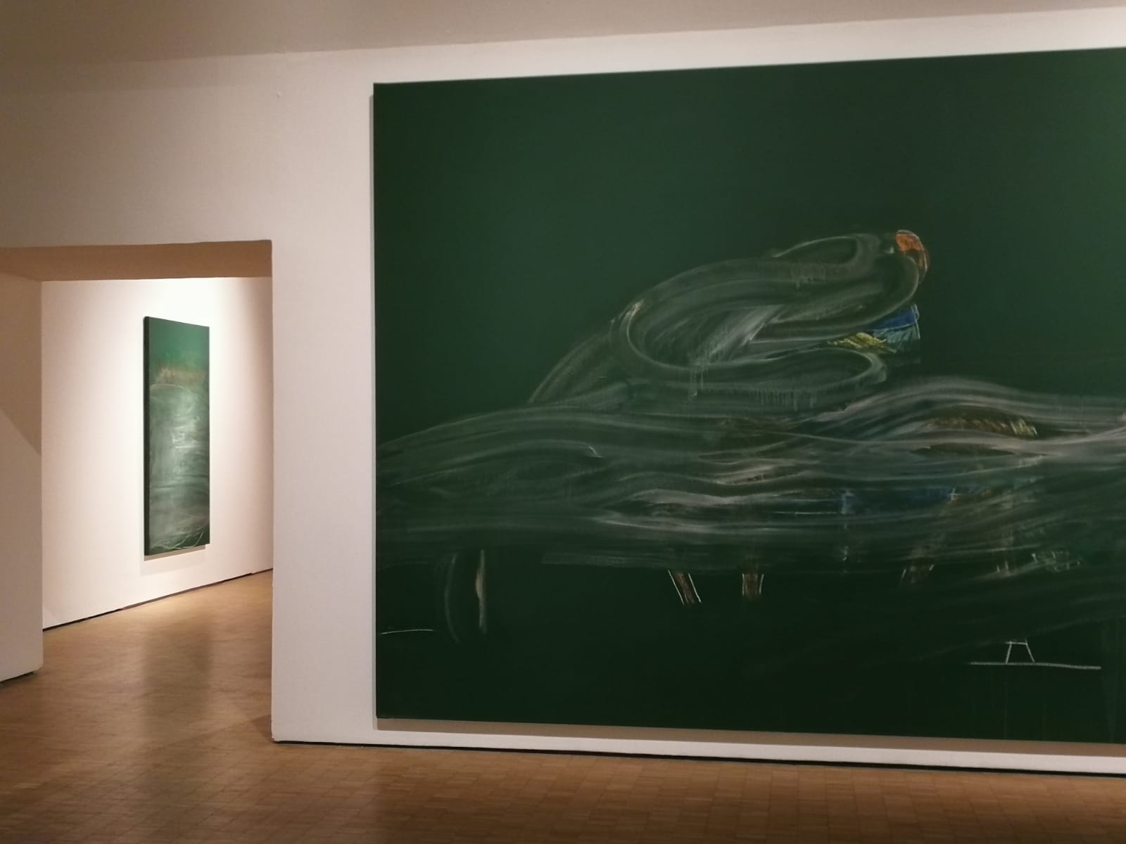 Le lavagne, in realtà tele perfettamente coperte di colore dalla Akermann, aderiscono alla tradizione pedagocica steineriana e abbandonano il nero, quasi a rintracciarne nell’oscurità una vuotezza di fondo, in favore del verde. Tonalità forse più incline alla creazione, ma non certo ad uno sconfinamento in territori sereni. I corpi rappresentati e poi nascosti dall’artista sembrano alimentati da un tormento analogo alle figure realizzate da Francis Bacon. Il tratto nervoso e la fisicità contorta lasciano emergere ogni dissidio e contrasto interiore. Una ragazza posa rannicchiata sull’indefinita tavola verde, una serie di arabeschi ne incorniciano le guance piene, gli occhi grandi, lo sguardo sereno. Ma sulla mano destra un ferro da stiro è rivolto verso il petto della ragazza, pronto a bruciare la carne e a soffocare il dolore tra le urla.