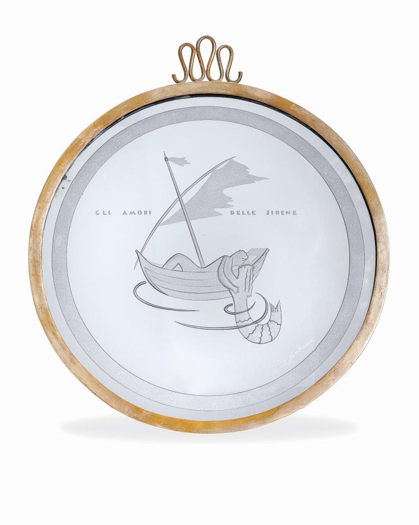 Circolare, entro cornice in ottone cromato con fregio superiore a nastro, vetro argentato inciso in basso a destra ‘Luigi Fontana’, produzione Fontana Arte 1931. 46,7 x 40,5 cm