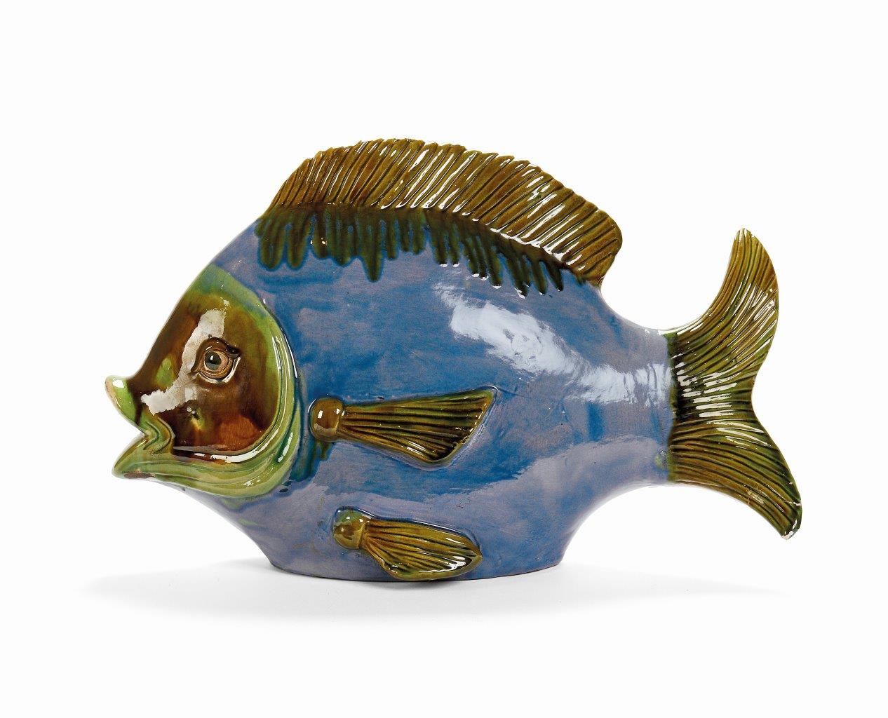 Grande scultura in ceramica smaltata in blu, giallo e verde.
