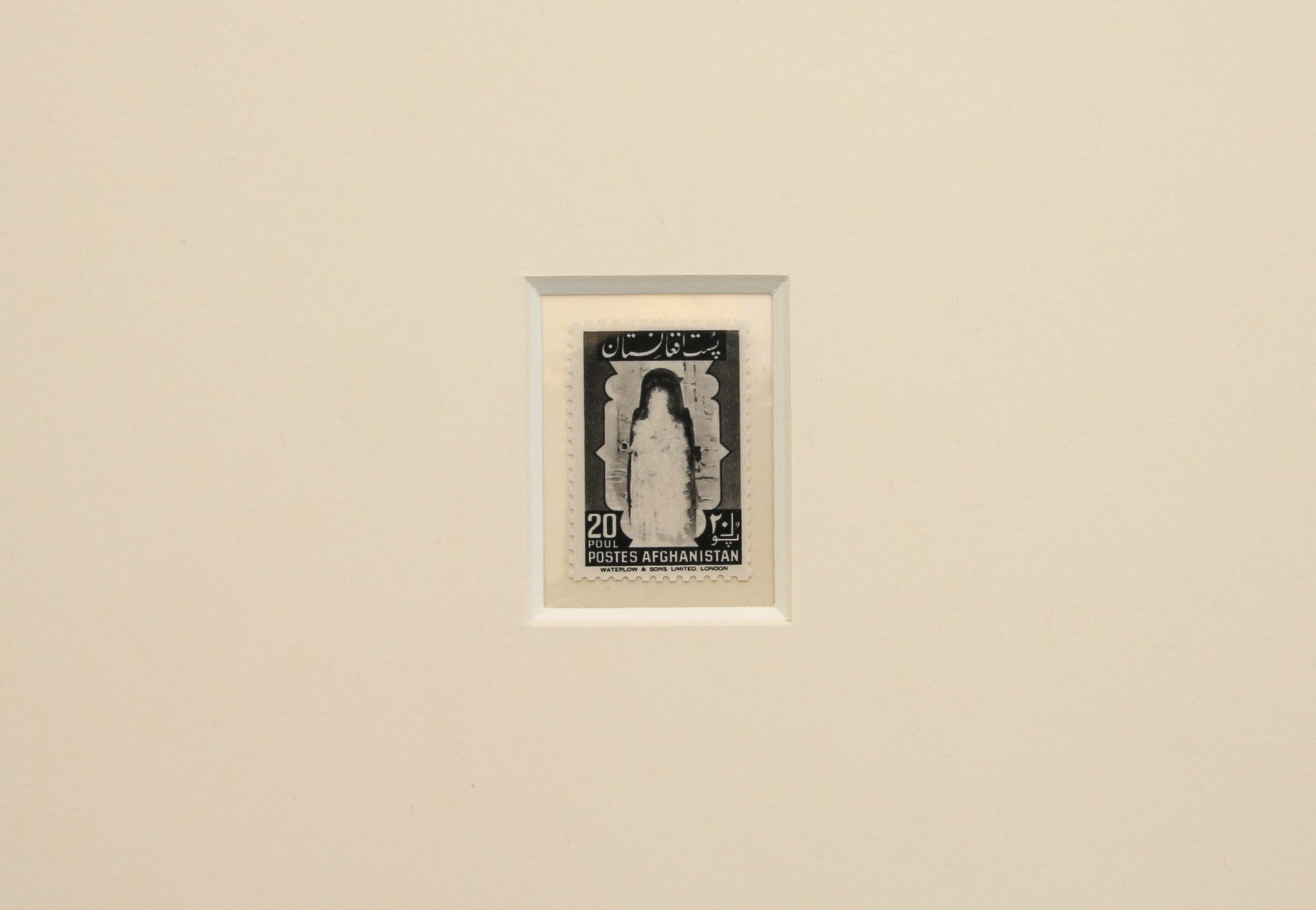 intervento su francobollo, 3 x 2 cm, Afghanistan, 1951 Buddha Bamiyan stamp — serie di 9, courtesy immagini UNA