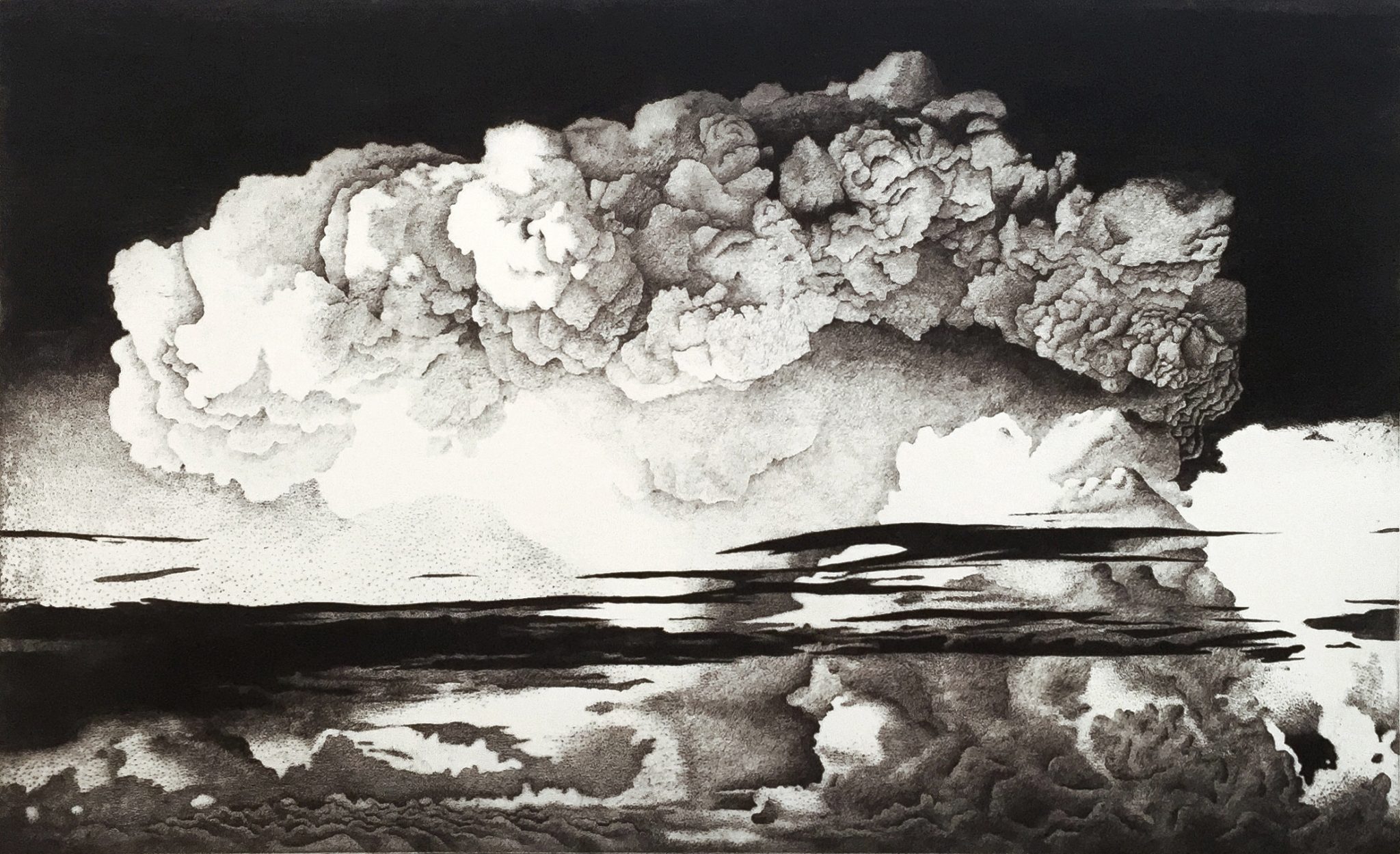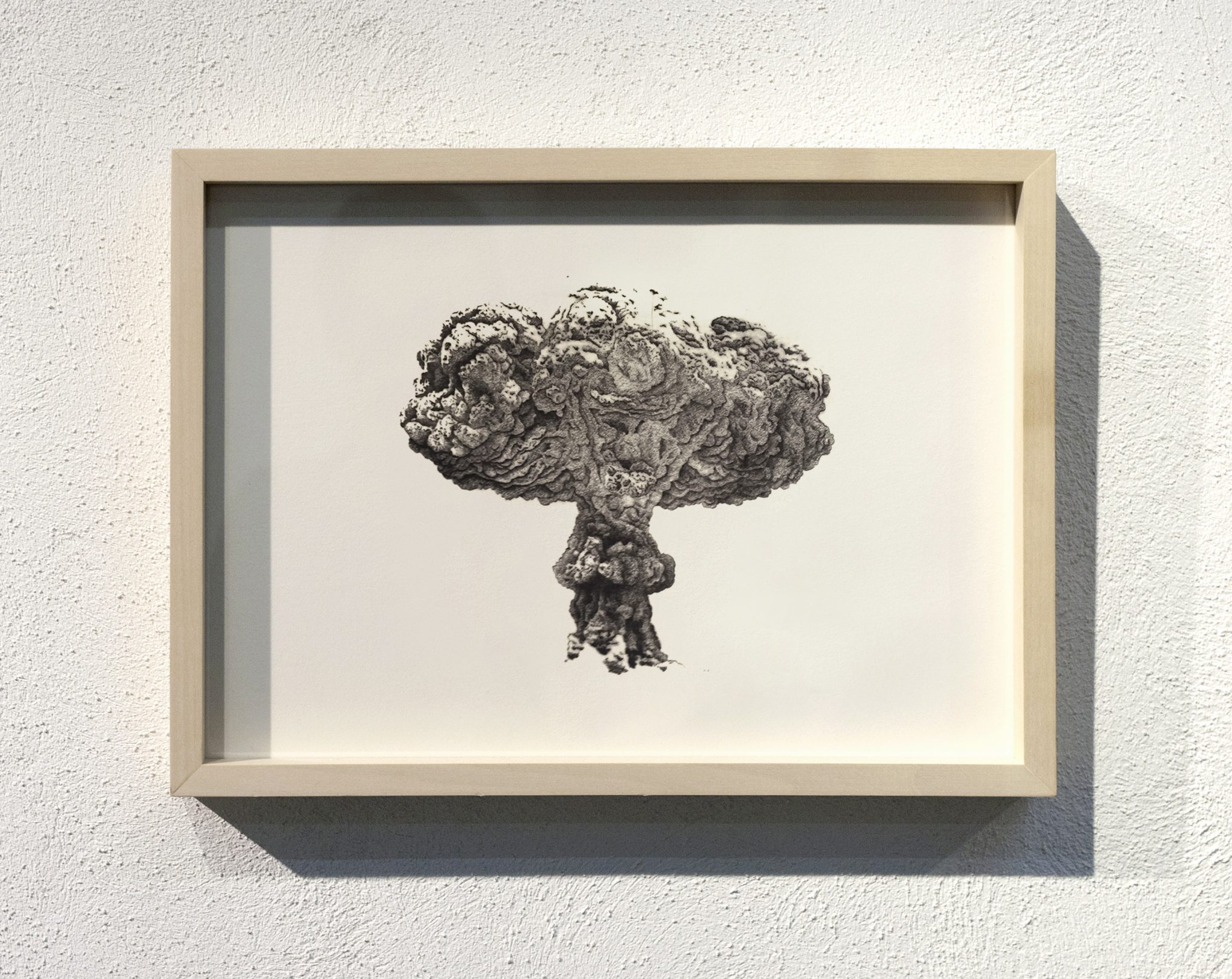 Stefano Serretta lo conosco da neanche un anno, ci siamo visti due sole volte, una a Parma e una a Milano, io abito a Parma e lui a Milano. Ci sentiamo al telefono, solitamente lo chiamo io. Nel suo studio c’era un monotipo appoggiato a terra, una carta incisa, un fungo nucleare che occupava l’intero foglio. La declinazione in scala ridotta di un’esplosione esagerata, come lo sono le cose troppo grandi di cui facciamo fatica a comprendere l’estensione temporale. Era per terra, mezza avvolta nel cellofan, residuo di qualche impacchettamento post mostra. La plastica conteneva la detonazione, il suo valore simbolico pronto a far sentire il proprio rumore una volta liberato. Serretta mi racconta che quella è solo una parte del lavoro, una ricerca sul significato di Antropocene, We last, sull’era geologica attuale e su tutti i residui che resteranno nello strato roccioso, residui che avranno traccia di radioattività, lo spauracchio degli ultimi decenni, di test fantastici nella loro spettacolarità imprevedibile, di un amore folle per la distruzione omnicomprensiva. Il fungo rimane lì nella sala, con la plastica che sembra cedere, nell’attesa che il simbolo perda la sua funzione illusoria. Gli parlo di un progetto editoriale, lui della sua tesi, interviste sull’11 settembre, su come ha condizionato l’immaginario economico e iconografico. Un altro simbolo, come il fungo sul pavimento. Un aereo che si schianta contro un grattacielo, un’esplosione, l’unica cosa che la mostra generazione si ricorderà, il nostro “dov’eri in quel momento?”. Due deflagrazioni nella stanza, tutte in potenza impacchettate. Tutto in potenza come in una mostra, con le opere appese alle pareti, un trauma compresso in una cornice e schiacciato sotto un vetro, tutto bloccato in qualcosa che potrebbe esplodere, ma non lo fa per timidezza o paura di far male.