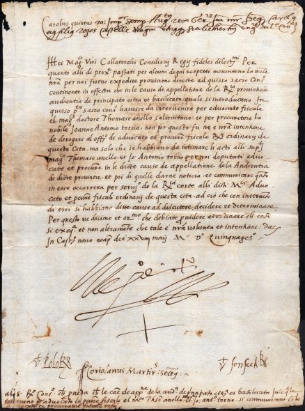 Nella foto: 1550 – CARLO D’ASBURGO – Lettera a firma di Carlo V d’Asburgo, jo el Rey, Imperatore del Sacro Romano Impero, Re di Napoli, Re di Spagna, Re di Sardegna e Re di Sicilia.