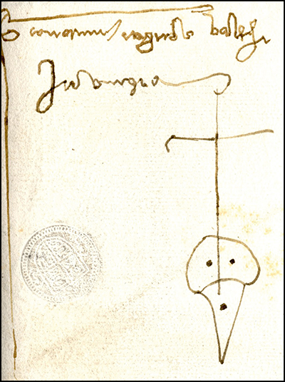 1450 ca. – Sovracoperta di lettera, senza testo interno, da Milano a Venezia, con gilda mercantile e bollo a secco con stemma sforzesco con le iniziali FS, Francesco Sforza.