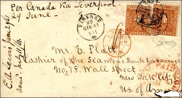 1861 – 80 cent. carnicino (22), due esemplari, uno ben marginato, l’altro con due margini sfiorati, su busta da Firenze 22/6/1861 per gli Stati Uniti. La lettera venne affrancata per errore con la tariffa prevista per il Canada, al posto di quella da 1,20 lire per gli Usa, probabilmente a causa dell’indicazione manoscritta per Canada, nome del bastimento (Cunard Line) che collegava Liverpool con New York. Cert. Colla.
