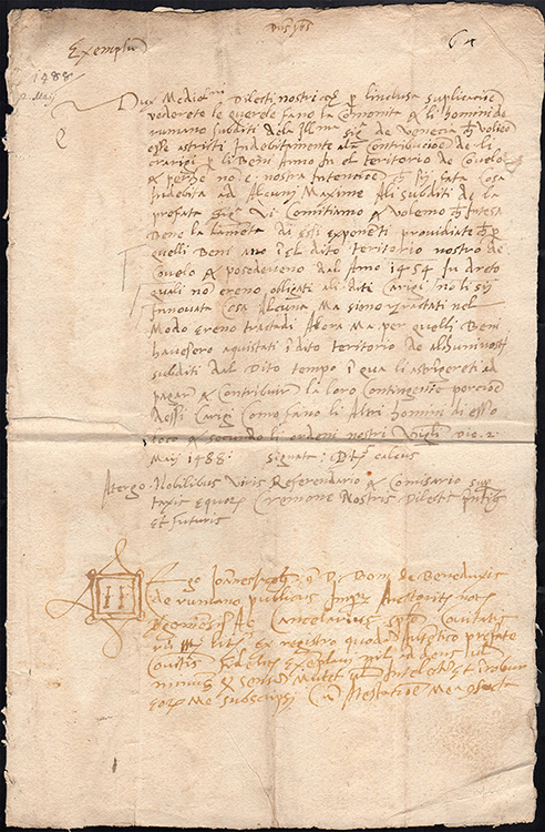 1488 – Copia manoscritta, coeva all’originale, di una lettera del Duca di Milano Gian Galeazzo Maria Sforza, inviata da Vigevano 2/5/1488, alla Comunità di Rognano, Repubblica Veneta, relativa alla proprietà sui beni del territorio di Covelo. Allegato regesto della dott.ssa Piccinini.