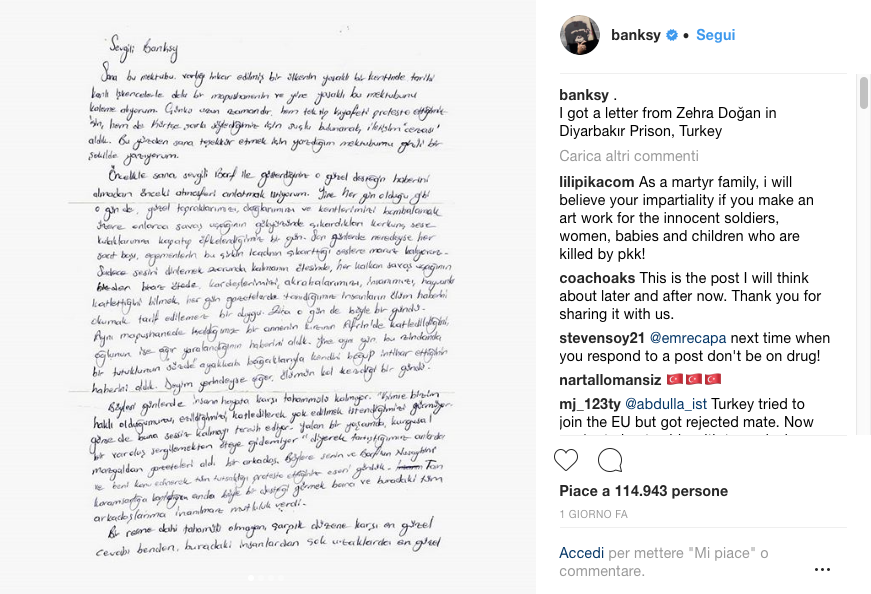 “Questa lettera è illegale”. Così inizia la lettera per Banksy scritta dal carcere dall’artista Zehra Doğan