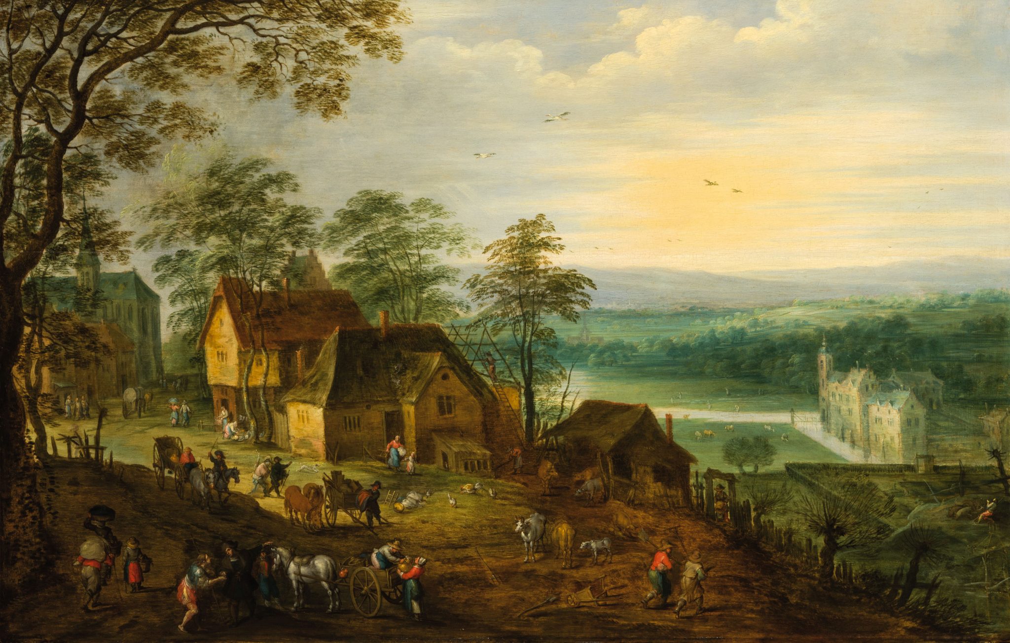 Jan Brueghel il giovane (Anversa, 1601 – 1678), Paesaggio con villaggio rurale e castello, Olio su tavola, cm 52X80,5.