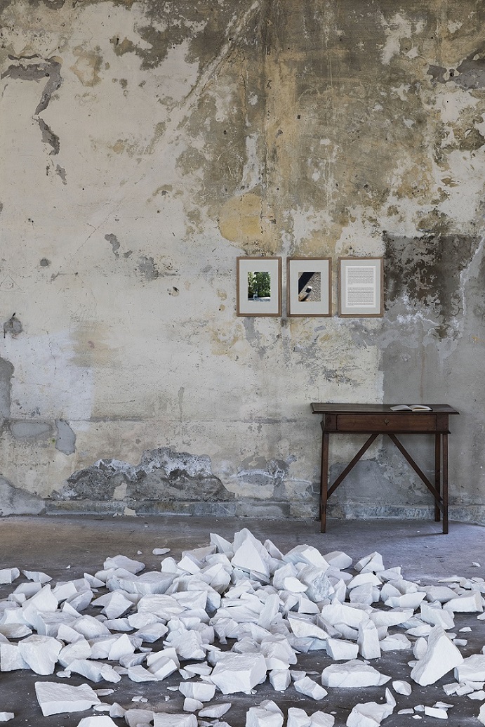 David Horvitz con Tentatively Untitled cerca nel marmo la fragilità, non la solidità. Horvitz ha voluto disperdere un blocco di marmo che ha identificato in una cava in cima alla montagna, riducendolo in frammenti che il pubblico può portar via con sé. La scultura non scomparirà ma verrà dispersa, destinandola alla transitorietà dell’immaginazione e della memoria, come la storia di un soldato americano giapponese morto nella seconda guerra mondiale che Horvitz riattiva attraverso due fotografie che lo commemorano sia a Los Angeles che a Pietrasanta.