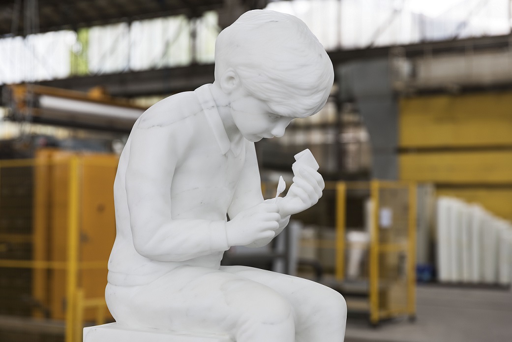 Il piano sentimentale e l’archetipo del fanciullo sono invece i registri in cui si muove la più recente ricerca di Diego Marcon. La sua opera, Ludwig, è la “materializzazione marmorea” di un bambino realizzato da un modello 3D, un piccolo monumento alla fragilità e alle ambivalenze della vita. Nell’opera di Marcon la figura del bambino è una figura vulnerabile, che per lo più stimola compassione, attivando un desiderio di “prendersi cura”. Allo stesso tempo, quella dell’infanzia è una condizione che tutti gli adulti hanno vissuto ma che torna a essere aliena e misteriosa quando viene superata.