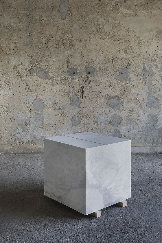 Francesco Arena presenta Metro cubo di marmo con metro lineare di cenere, un’opera in cui un materiale nobile come il marmo si confronta con la cenere del sigaro. Quest’opera nasce direttamente dalla ricerca fatta dall’artista presso Henraux. ll marmo è un’immagine della durevolezza nel tempo, mentre la cenere è un’immagine di quanto impermanente sia l’esistenza umana. L’opera è l’unione di due linee temporali differenti, quella della pietra e quella dell’uomo, i milioni di anni da una parte e i decenni dall’altra.