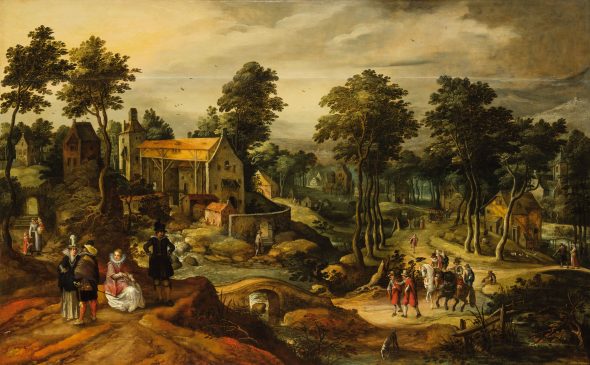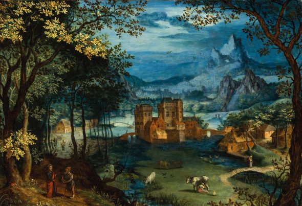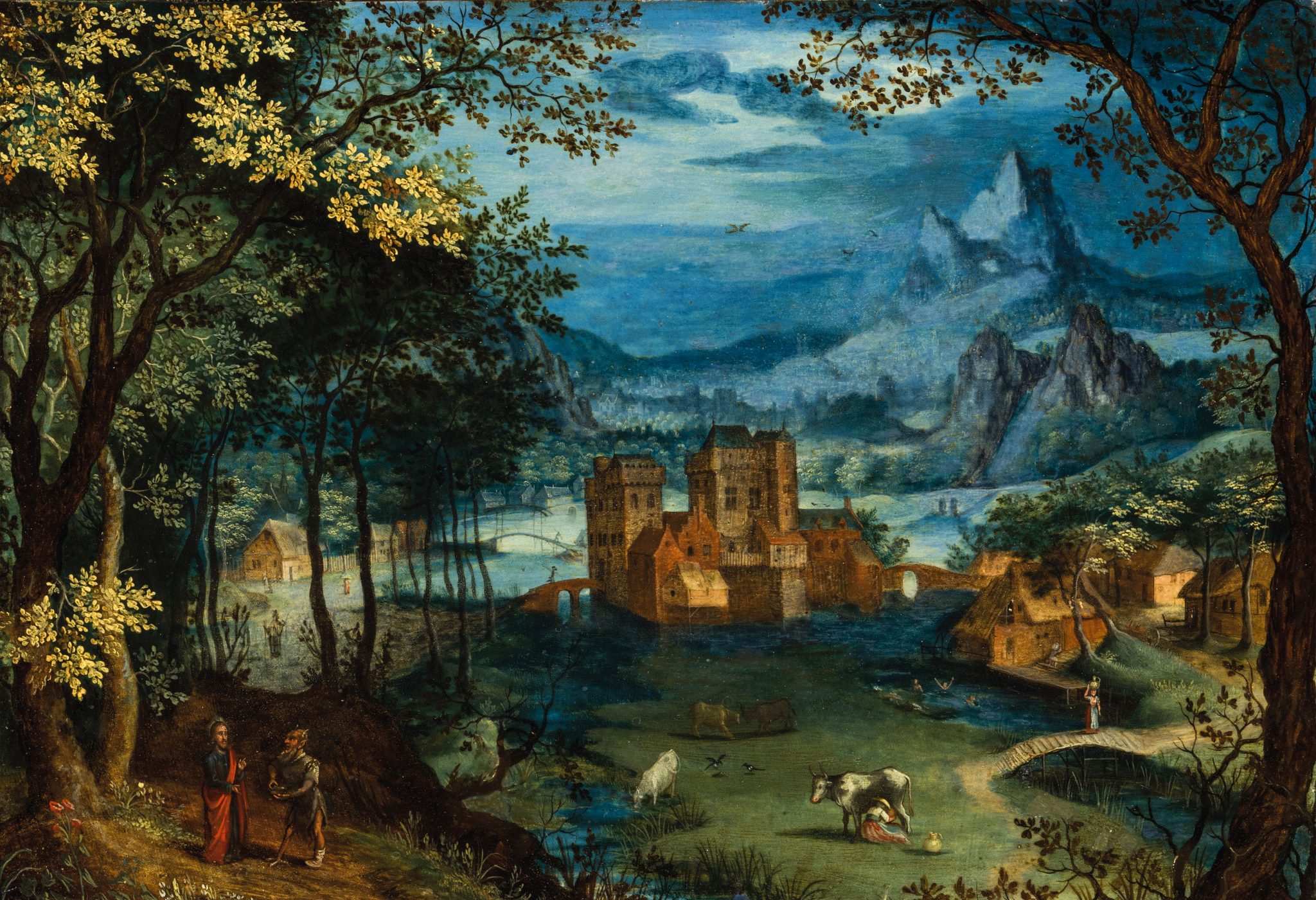 Jan Brueghel il giovane (Anversa, 1601 – 1678), Paesaggio con villaggio rurale e castello, Olio su tavola, cm 52X80,5.