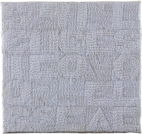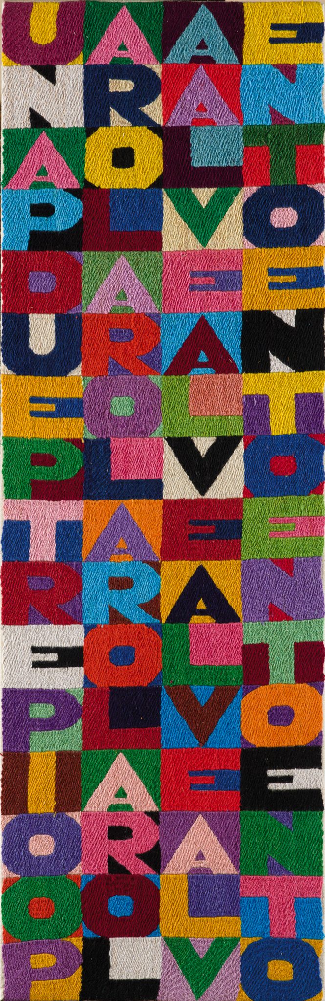 Alighiero Boetti (Torino 1940 – Roma 1994), Una parola al vento, 1989 circa, Ricamo su tessuto, cm 82,7 x 26.