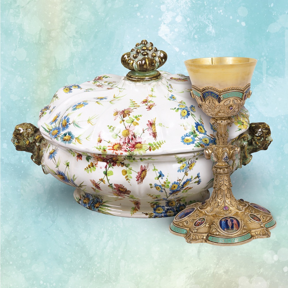 La prima sezione, ad esempio, sarà dedicata al fiordaliso, simbolo di Cristo nell’iconografia cristiana che viene spesso ripreso nei dipinti dell’Assunzione della Vergine, la Resurrezione e l’Ascensione. Qui ad una elegante zuppiera realizzata tra il 1883 e il 1890 dalla Cooperativa Ceramica d’Imola e decorata a mazzetti di fiori recisi tra cui spiccano numerosi fiordalisi, sarà unito un raffinato calice veneziano in argento, donato da papa Pio VII al Capitolo della Cattedrale di Imola, sul piede del quale vi sono quattro sculture, una delle quali raffigura l’Assunzione della Vergine, poiché il fiordaliso ne è il simbolo.