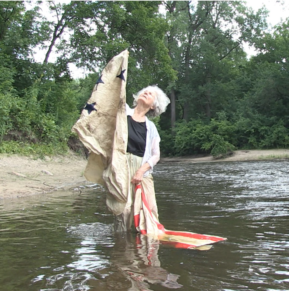 “Sono contenta di esporre lavori recenti, un trittico di video correlati. Come centro di gravità della mostra, “On an Iron Post”, questi presentano un coinvolgimento intimamente fisico con l’oceano, il fiume, il lago e con la sabbia, l’acqua e la neve. Ogni video si riferisce in qualche modo al mondo più ampio, con una massa di giornali, una bandiera astratta, e una piccola radio nera a manovella. Non è presente un messaggio previsto, ma piuttosto un invito a lasciare che il vostro corpo abbia le proprie idee e pensieri”.