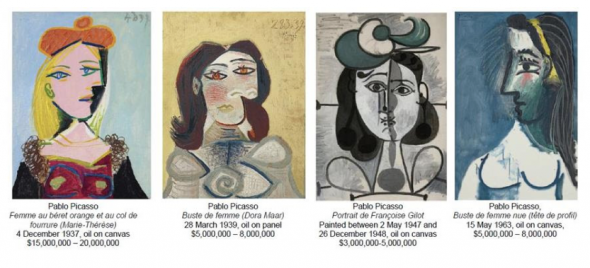 Provengono dalla collezione di Sam Rose e sua moglie Julie Walters, saranno vendute nella big auction newyorkesi del prossimo 11 novembre e hanno una stima collettiva di $ 28 milioni. Il ritratto più importante e più costoso è quello di Marie-Thérèse che è quotato $ 15 milioni. Seguono Dora Maar e Jaqueline Roque stimate entrambe 5 milioni e infine Françoise Gilot ($ 3 milioni).