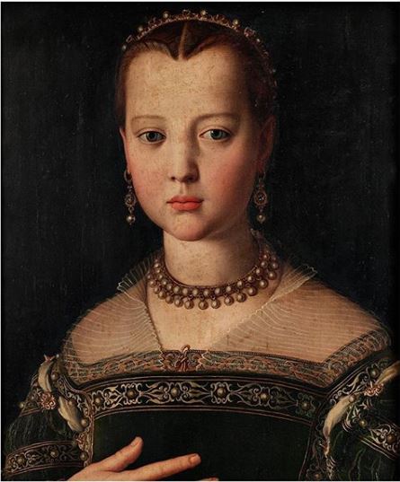 Specchio della società e dei costumi del tempo, le opere d’arte sono preziosissime testimonianze delle tendenze in fatto di abiti, accessori e capigliature. La raffinata eleganza della Maria de’ Medici del Bronzino non può che ammaliare. D’altro canto, il Bronzino era un maestro nel descrivere minuziosamente i gioielli e la meravigliosa collana di Maria ne è un esempio.