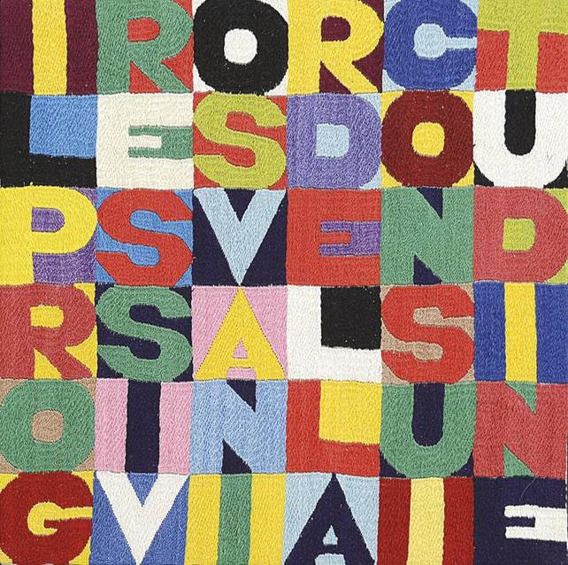 Il progressivo svanir della consuetudine, 1989 arazzo a ricamo su tela 33×33 cm, firma, anno e località (Peshawar) al retro, opera registrata presso l’Archivio Alighiero Boetti (Roma) come da dichiarazione datata 20 Dicembre 2017 su foto.
