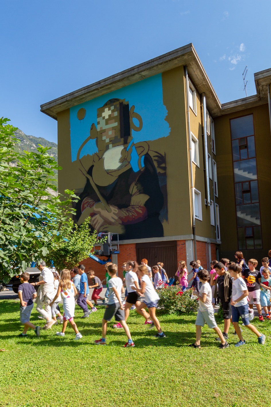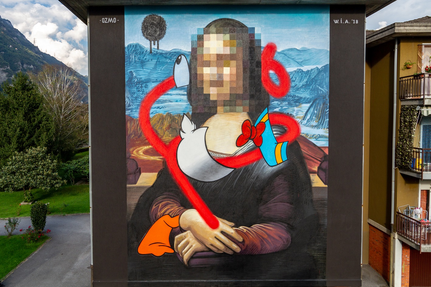 Il punto di partenza di ogni lavoro di OZMO è l’ispirazione che arriva dal territorio. Per il murale sulla prima palazzina di via Silone, quella che accoglie chi raggiunge il quartiere, l’artista ha scelto così di “appropriarsi” de ‘La Gioconda’, l’icona dell’arte mondiale nel cui sfondo si possono riscontrare intriganti corrispondenze con scenari sebini e camuni e in particolar modo con lo scorcio che si può intravedere percorrendo la strada – che da Angone porta al Convento dell’Annunciata – situata proprio a monte della parete consegnata al suo intervento. OZMO reinterpreta il più celebre dipinto al mondo creando détournements dadaisti: aggiunge elementi casuali tra i quali il segno rosso, copre il volto della misteriosa donna con dei pixel, raffigura l’anatra, l’animale emblematico del luogo e migrante per eccellenza, nella sua versione ideata da Disney, il Paperino caro a generazioni di bambini, mentre si scompone nello spazio pittorico. Dipinta con bombolette spray e acrilici, con le quali l’artista riesce a ottenere le caratteristiche estetiche tipiche della pittura a olio, ‘Pixeleted Mona Lisa with destructurated Donald Duck in Valle Camonica’, è un omaggio ad Angone e al genio di Leonardo Da Vinci, è un’opera contemporanea d’avanguardia che sperimenta una messa in discussione delle modalità espressive della tradizione dei murales e che si e ci interroga sull’uso e sul potere delle immagini artistiche.
