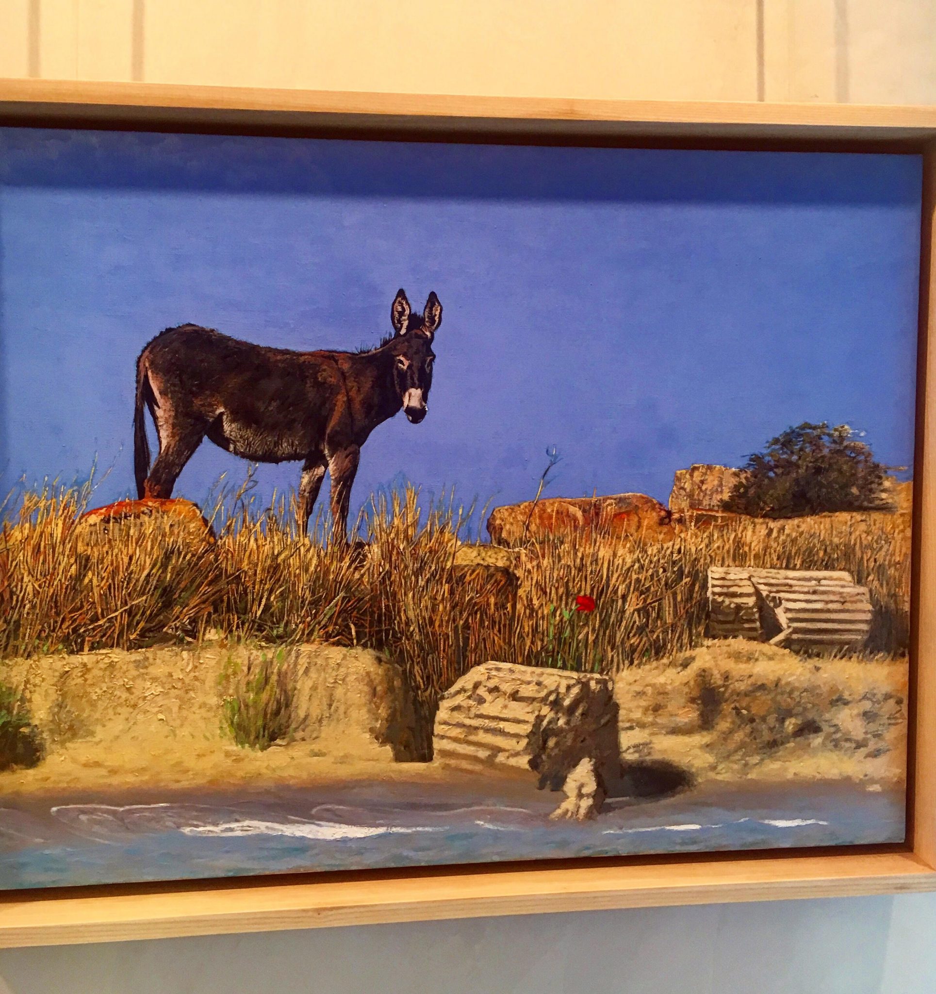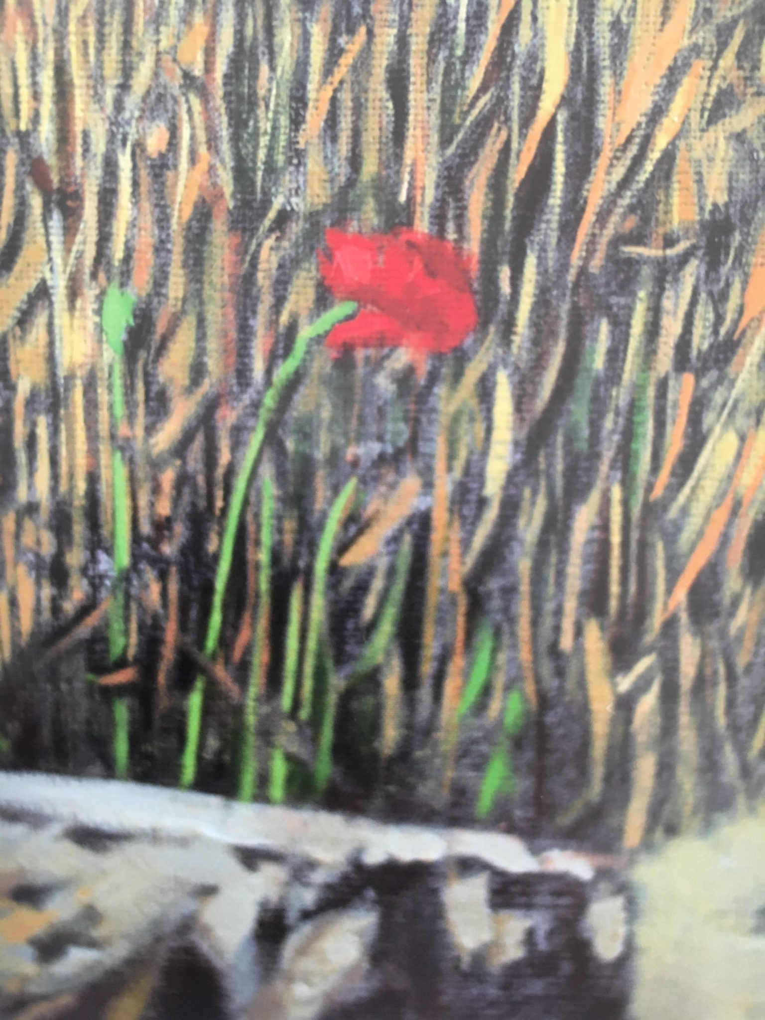 Posto frontalmente al primo quadro del trittico c’è un’altra tela colma di valenze simboliche che accentuano ancor di più l’indifferenza e la solitudine. L’attenzione è posta su due soggetti: l’asino, dalle orecchie dritte e dallo sguardo immobile che sembra rimproverare l’uomo per la sua disattenzione e il papavero rosso, che simboleggia un’utopica pace nel suo unico giorno di vita.