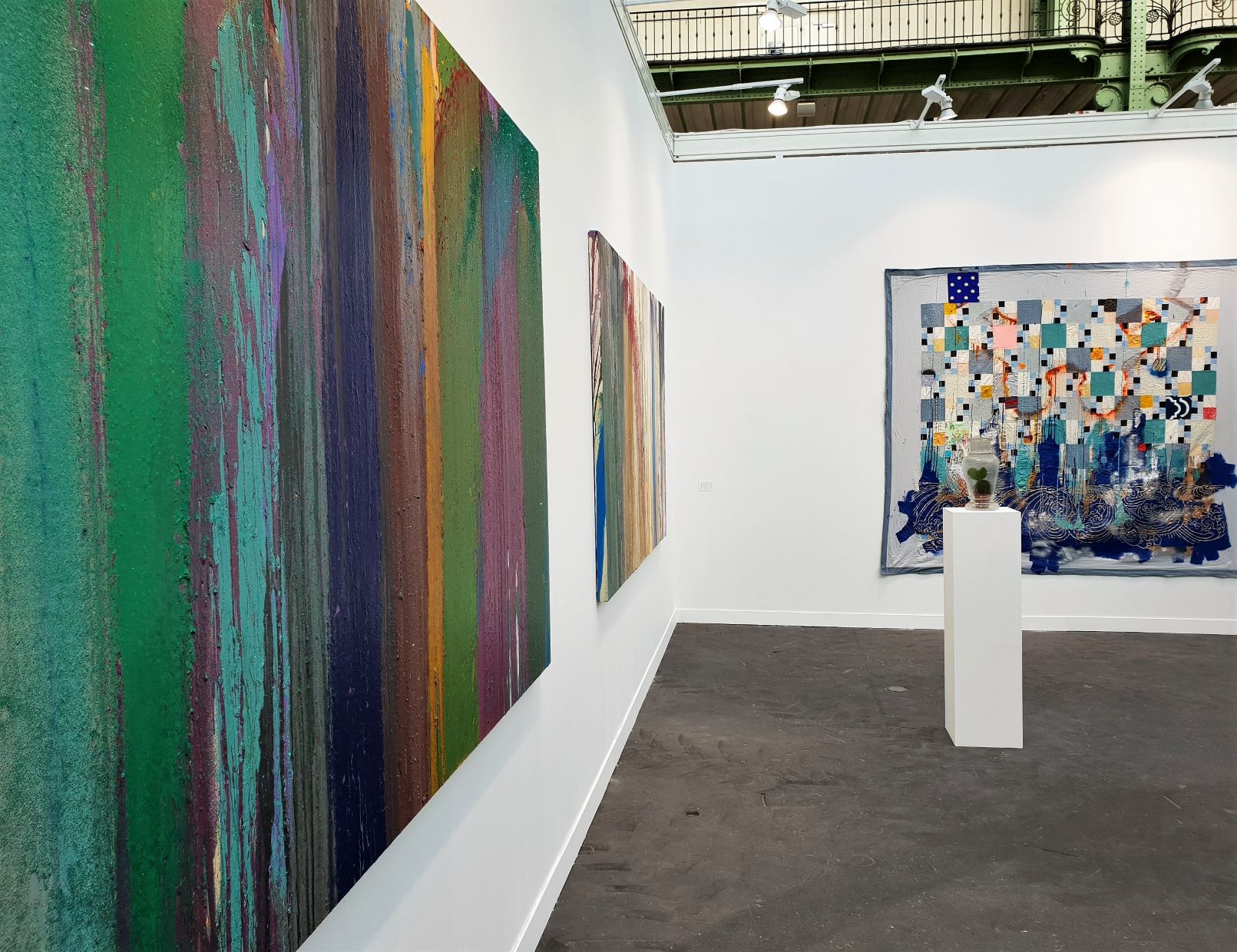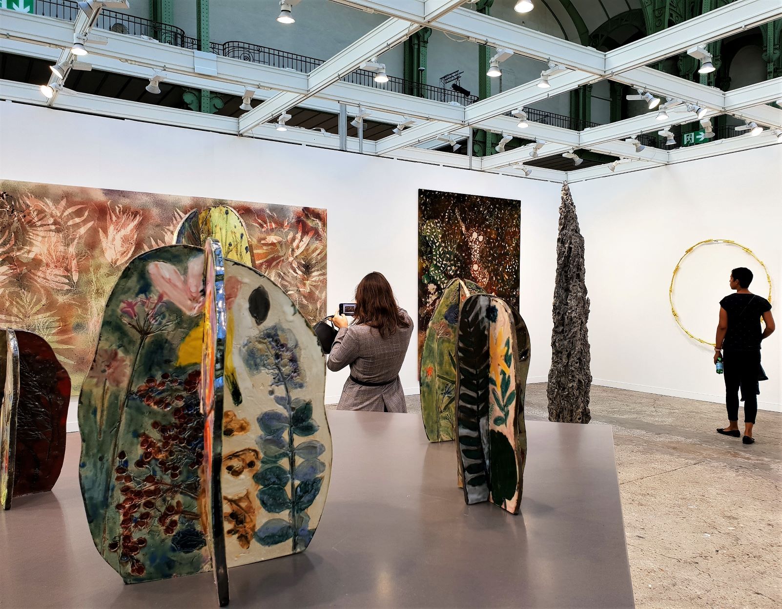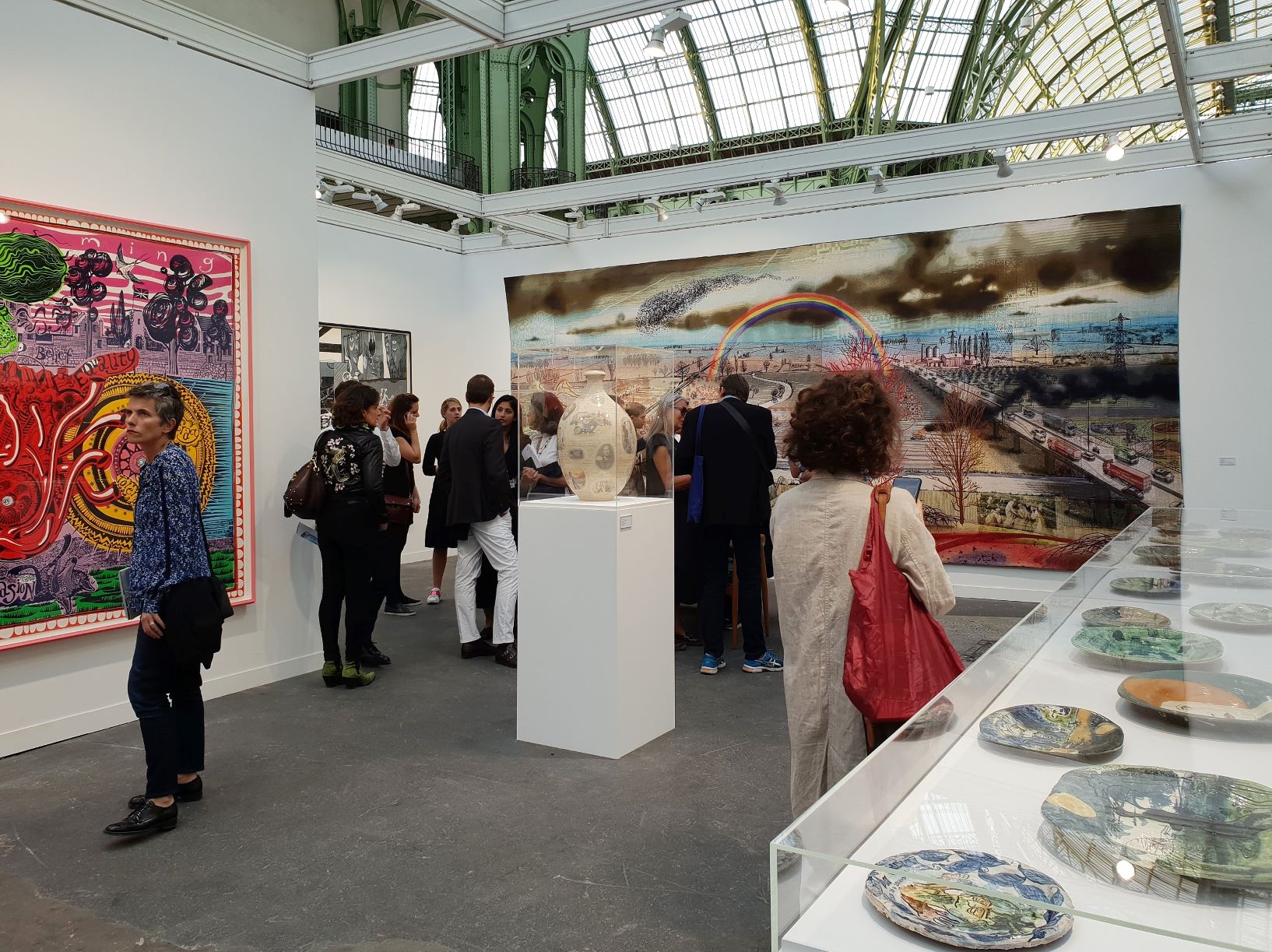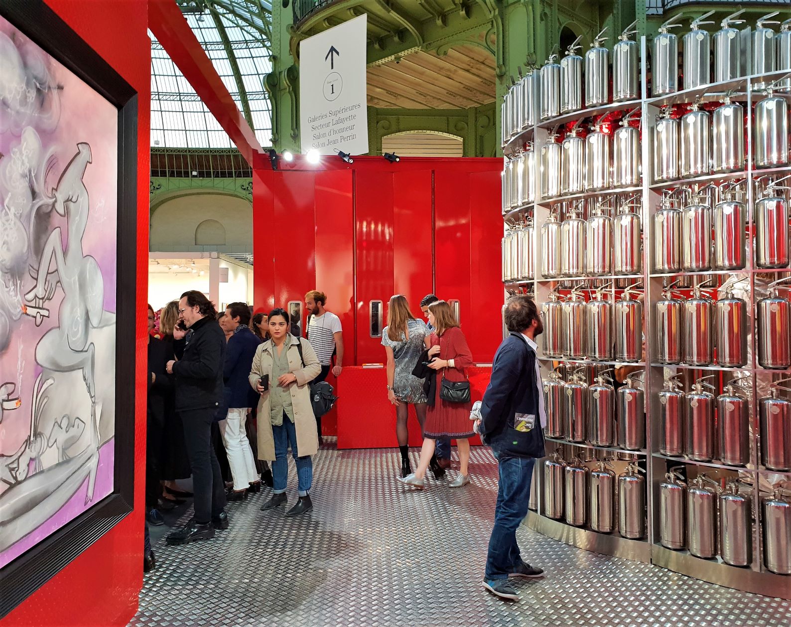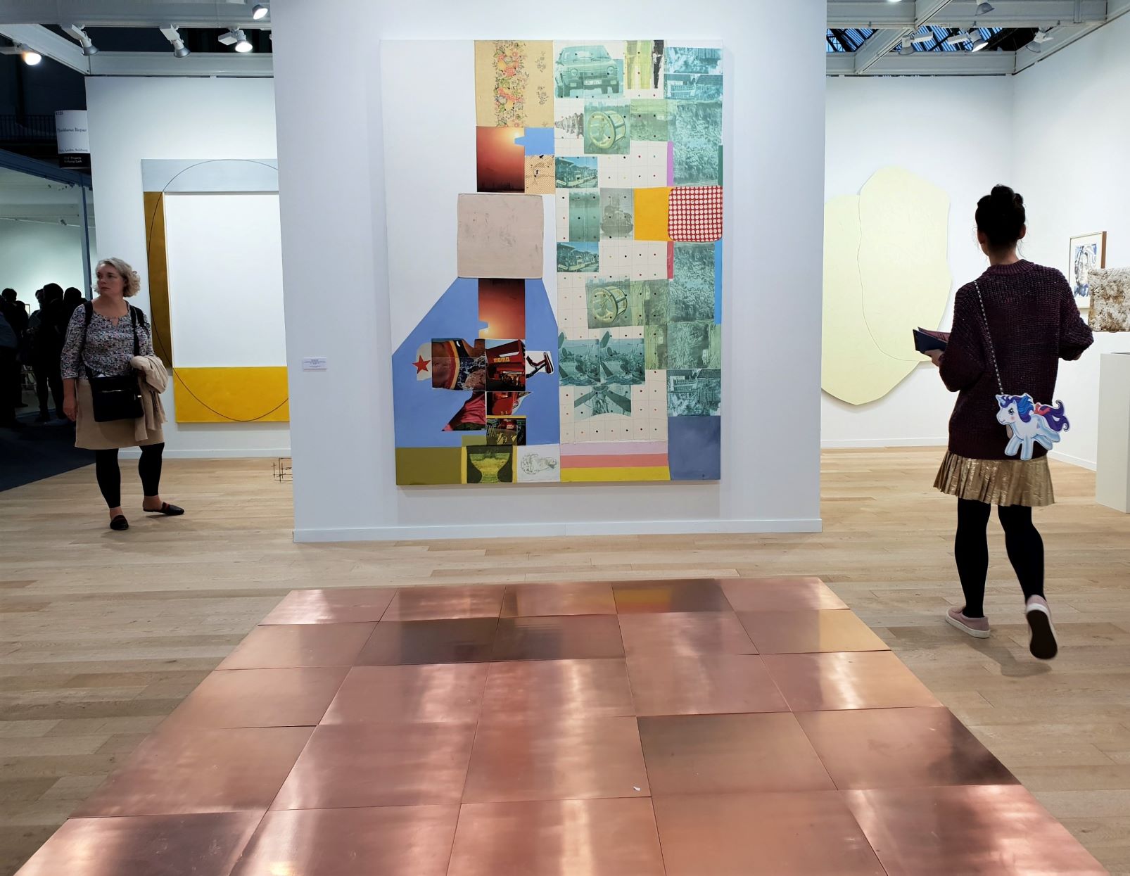 Passata Frieze, via con Fiac. Tutti al Grand Palais per la 45ª edizione della fiera d’arte moderna e contemporanea parigina, 18-21 ottobre 2018. Street painting analitico, a bande colorate, tappeto geometrico del duo Lang & Baumann per accedere (collegando il Petit e il Grand Palais sull’Avenue Churchill) all’ingresso della fiera. Una delle più riuscite installazioni delle “extra-sculture” fuori Fiac disseminate per la città, quasi sempre inutili e parecchio kitsch. Scheletro di vetro e ferro verdeggiante in questi giorni luminosissimo, vista azzurro terso, sulla scia dei 25 gradi della appena trascorsa manifestazione londinese. A Parigi, come a Londra 15 giorni fa, fa caldo. Niente vento, niente pioggia. Nessun giubbotto, nessun cappotto. Finite le giornate tra gli stand, tutti ai sempre molto radical (quanto efficaci) furgoncini street food che costeggiano il Palais verso la Senna. La fiera, molto simile alle passate edizioni (sia come artisti che come stand), si conferma anche quest’anno più curata, ordinata ed elegante della cugina d’oltremanica. Migliore. Nessun colpo di teatro (a parte il monumentale Ingres wood di Katharina Grosse piombato sotto la calotta metallica del Grand Palais da Gagosian, e lo scenografico e scintillante rosso “fuoco” di Gmurzynska -“On fire”, curato dal designer Alexandre de Betak- per scaldare l’algidità di casa) e vendite “ottime” subito dalla prima tornata (17 ottobre) dedicata a collezionisti e vip vari (si veda il secondo giorno, 18 ottobre, come già erano “trasformati” gli stand, sostituendo le opere vendute alle pareti). Progetti allestitivi in generale assai curati e gallerie italiane sugli scudi. Le 13 (su 195, da 27 paesi) realtà nostrane sono sicuramente tra i punti più positivi della fiera.