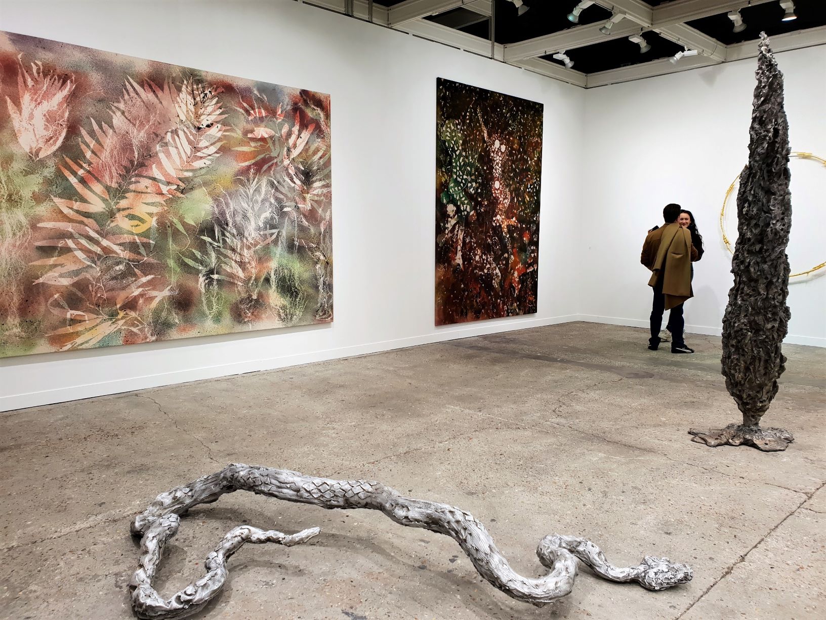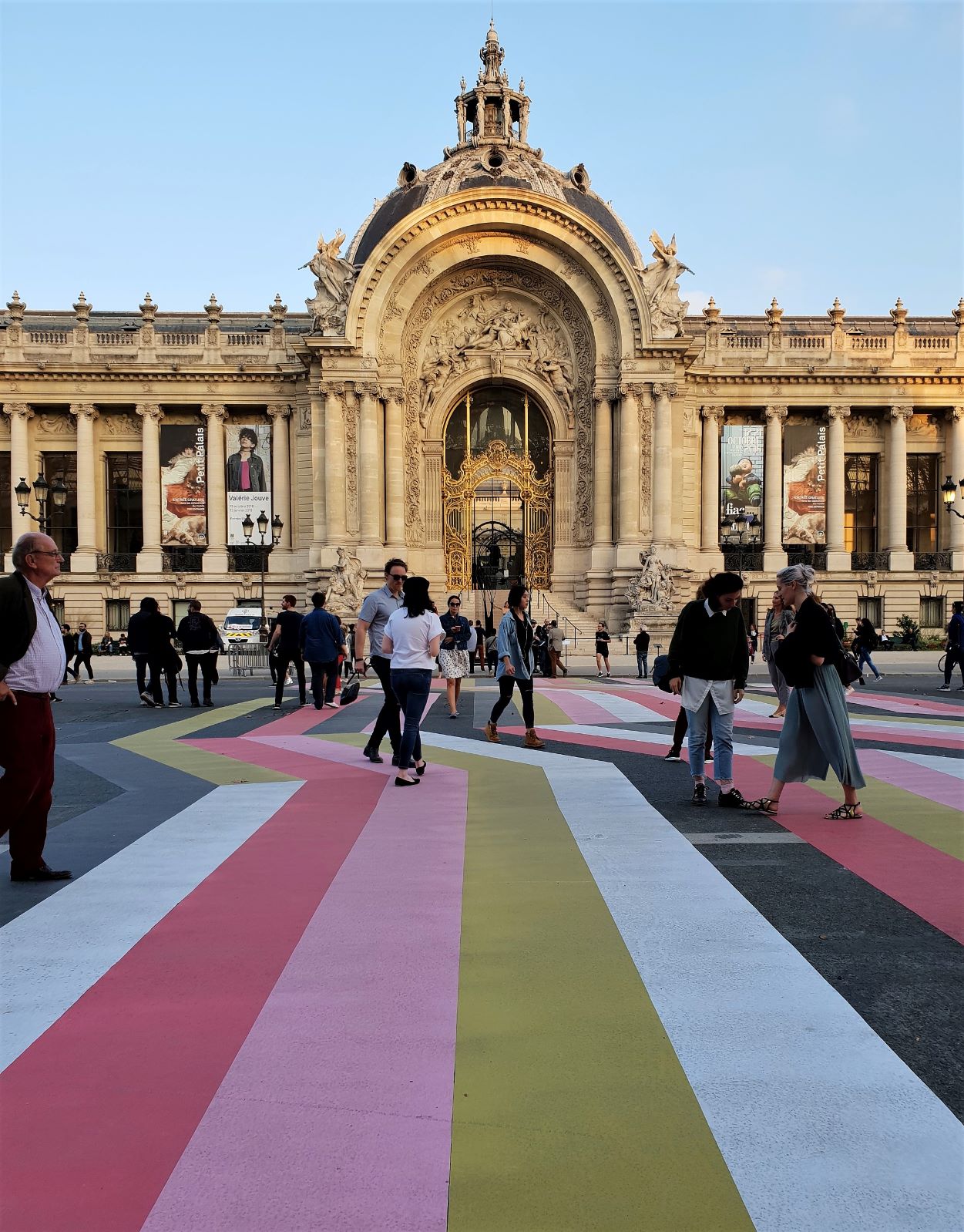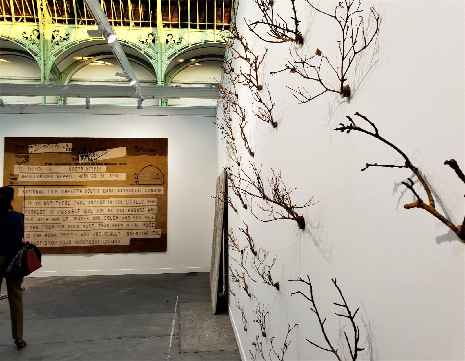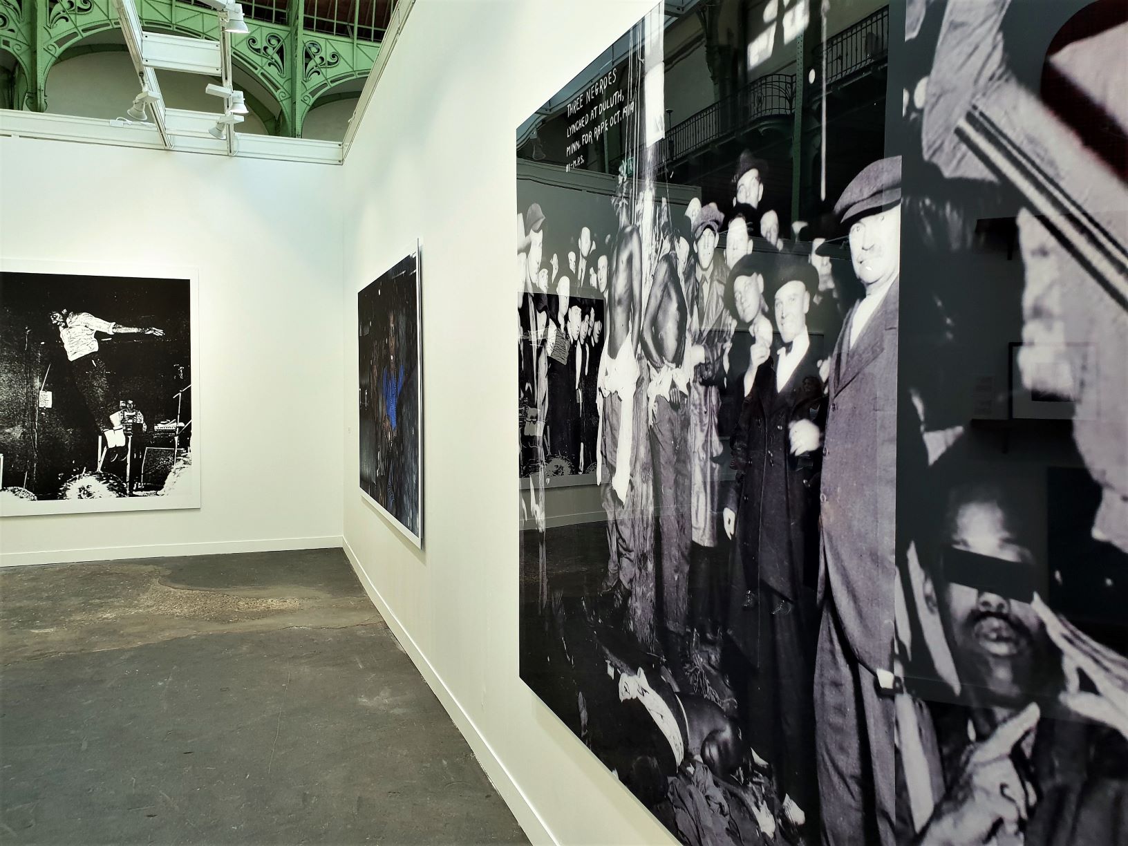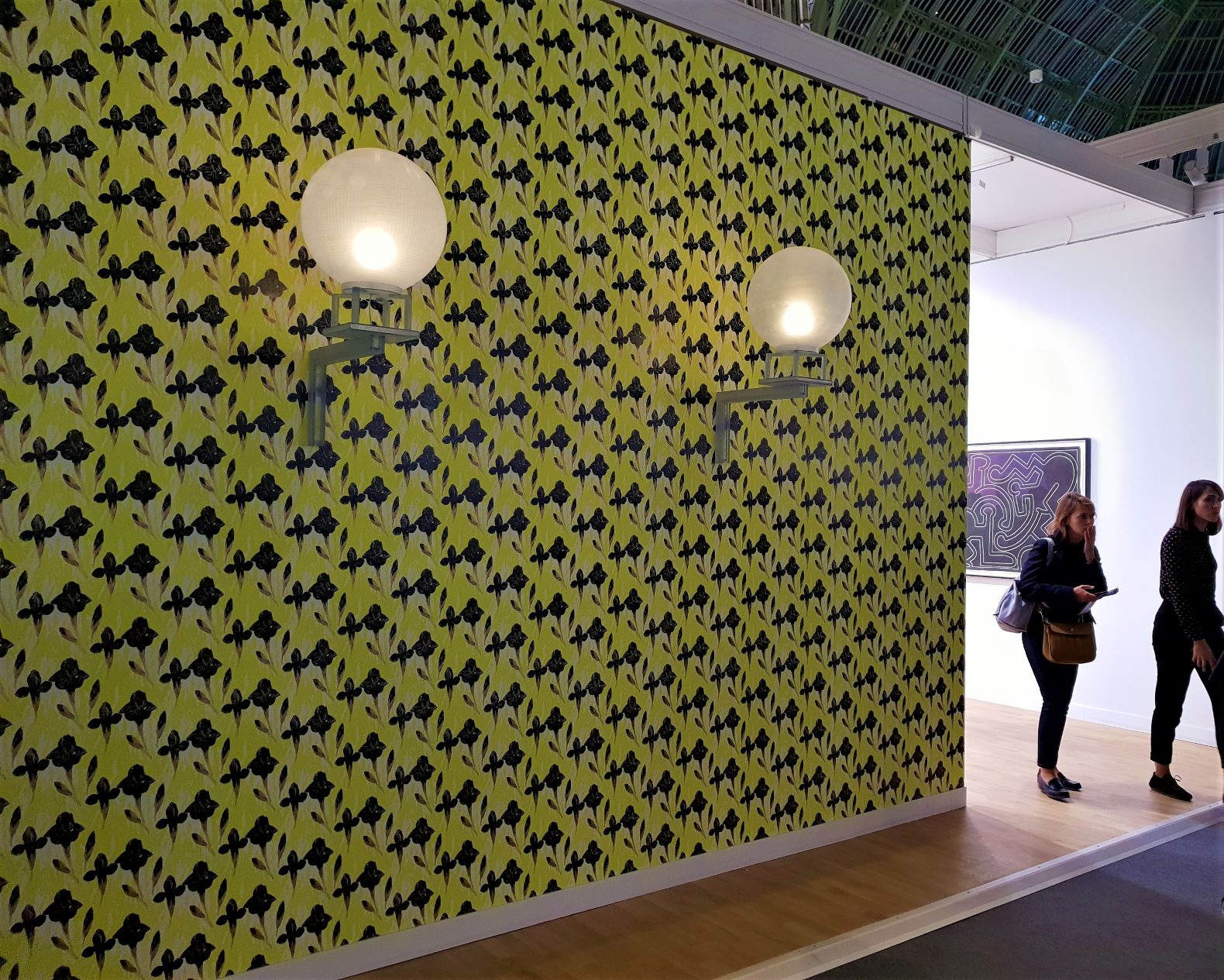 Passata Frieze, via con Fiac. Tutti al Grand Palais per la 45ª edizione della fiera d’arte moderna e contemporanea parigina, 18-21 ottobre 2018. Street painting analitico, a bande colorate, tappeto geometrico del duo Lang & Baumann per accedere (collegando il Petit e il Grand Palais sull’Avenue Churchill) all’ingresso della fiera. Una delle più riuscite installazioni delle “extra-sculture” fuori Fiac disseminate per la città, quasi sempre inutili e parecchio kitsch. Scheletro di vetro e ferro verdeggiante in questi giorni luminosissimo, vista azzurro terso, sulla scia dei 25 gradi della appena trascorsa manifestazione londinese. A Parigi, come a Londra 15 giorni fa, fa caldo. Niente vento, niente pioggia. Nessun giubbotto, nessun cappotto. Finite le giornate tra gli stand, tutti ai sempre molto radical (quanto efficaci) furgoncini street food che costeggiano il Palais verso la Senna. La fiera, molto simile alle passate edizioni (sia come artisti che come stand), si conferma anche quest’anno più curata, ordinata ed elegante della cugina d’oltremanica. Migliore. Nessun colpo di teatro (a parte il monumentale Ingres wood di Katharina Grosse piombato sotto la calotta metallica del Grand Palais da Gagosian, e lo scenografico e scintillante rosso “fuoco” di Gmurzynska -“On fire”, curato dal designer Alexandre de Betak- per scaldare l’algidità di casa) e vendite “ottime” subito dalla prima tornata (17 ottobre) dedicata a collezionisti e vip vari (si veda il secondo giorno, 18 ottobre, come già erano “trasformati” gli stand, sostituendo le opere vendute alle pareti). Progetti allestitivi in generale assai curati e gallerie italiane sugli scudi. Le 13 (su 195, da 27 paesi) realtà nostrane sono sicuramente tra i punti più positivi della fiera.