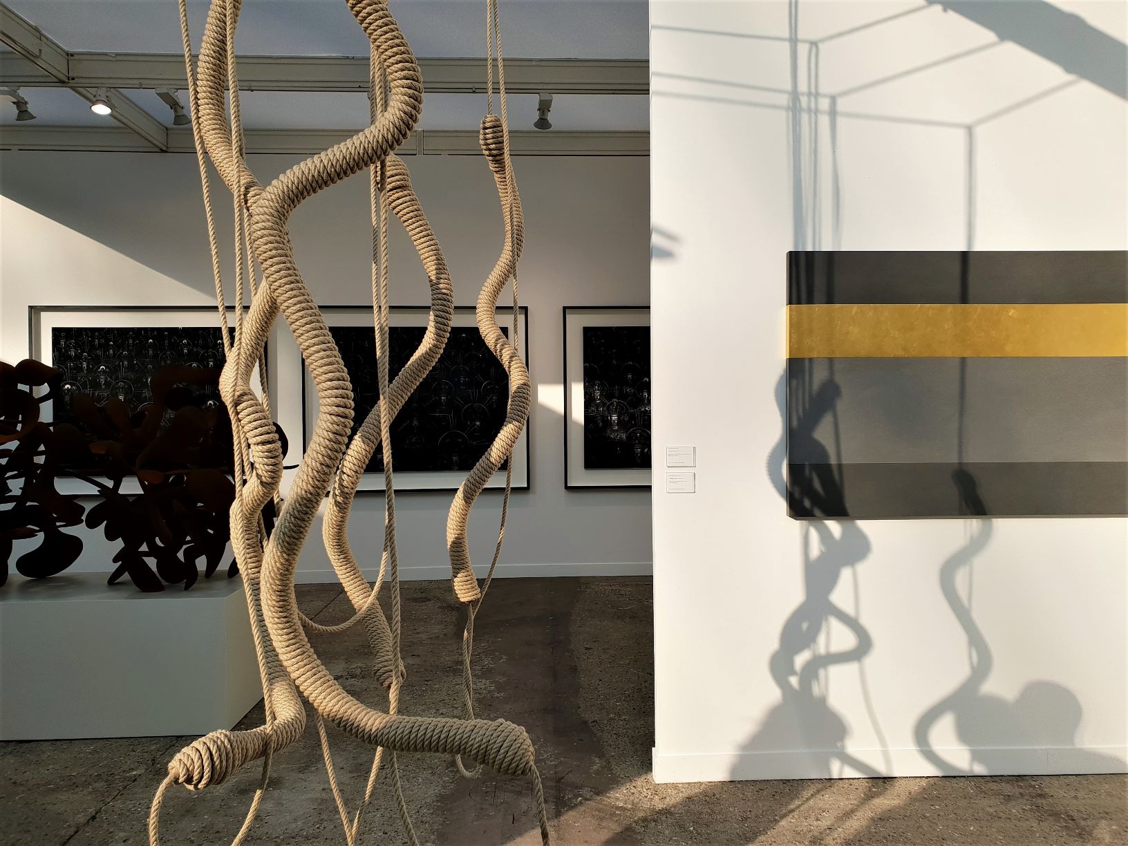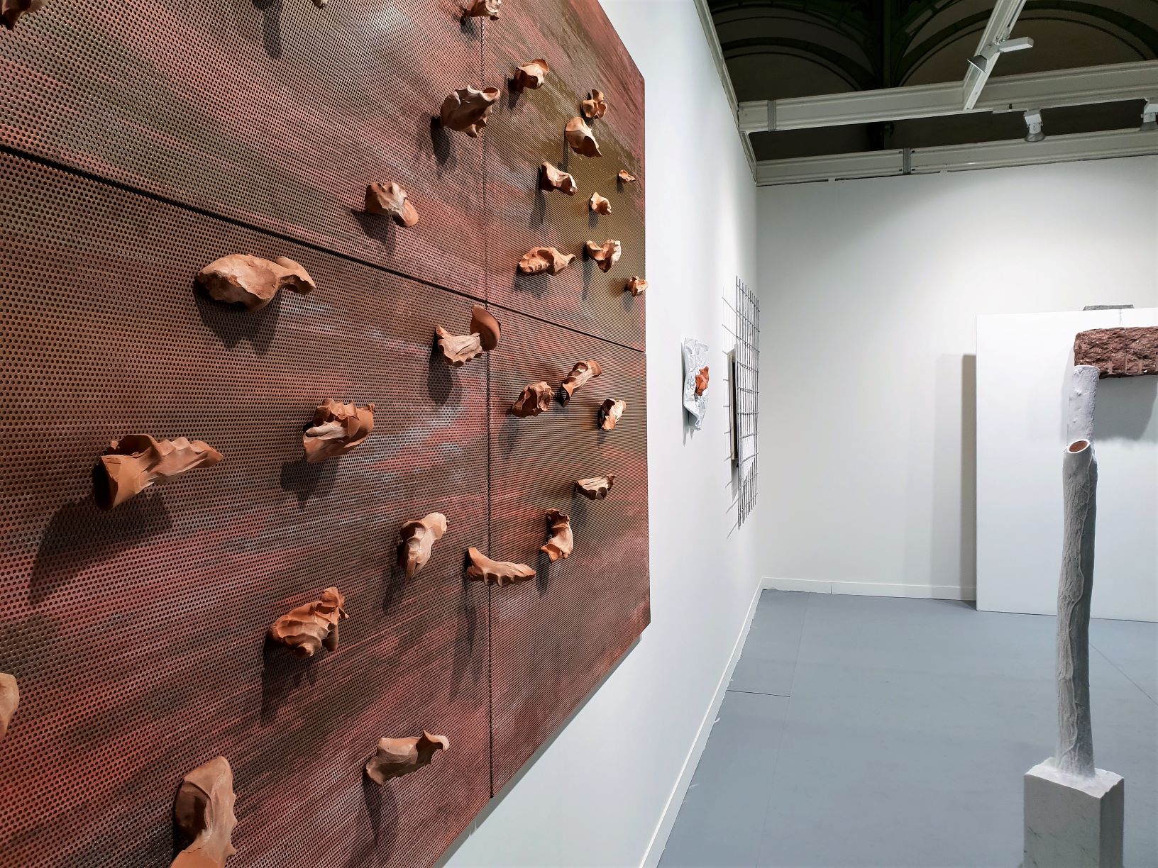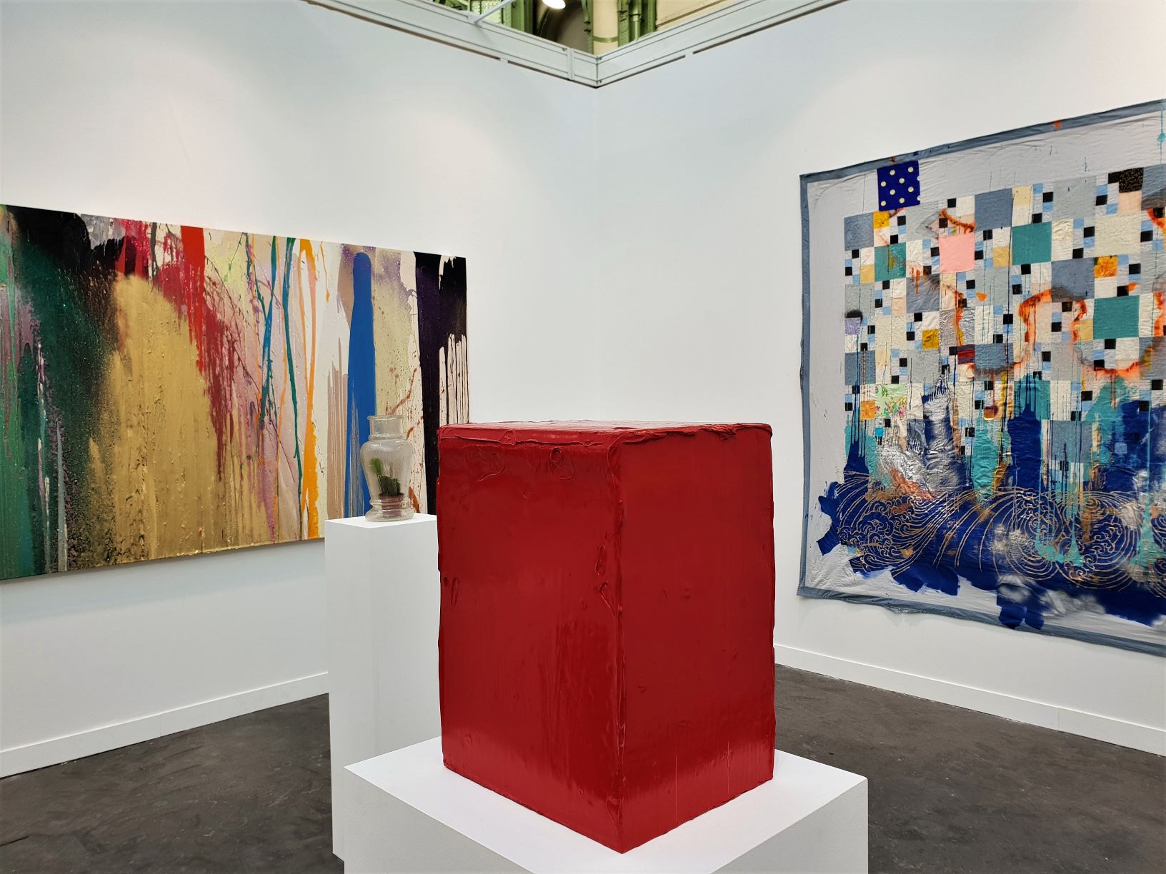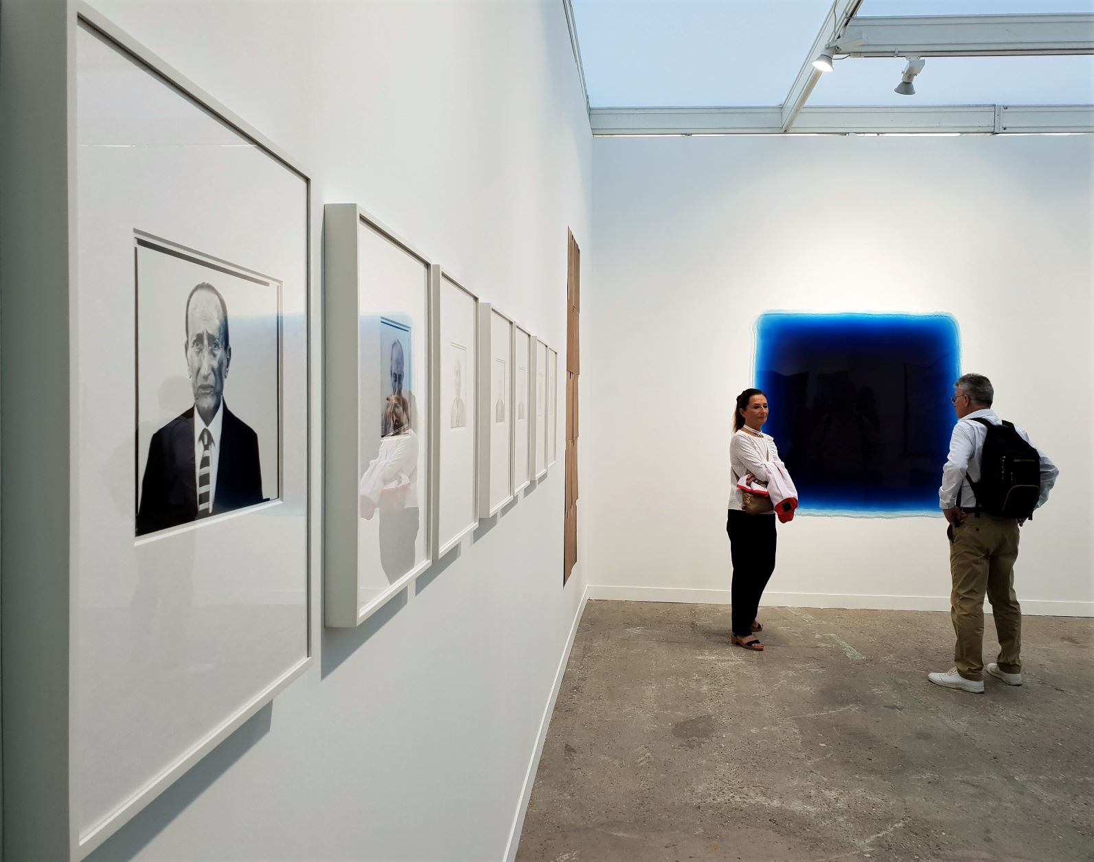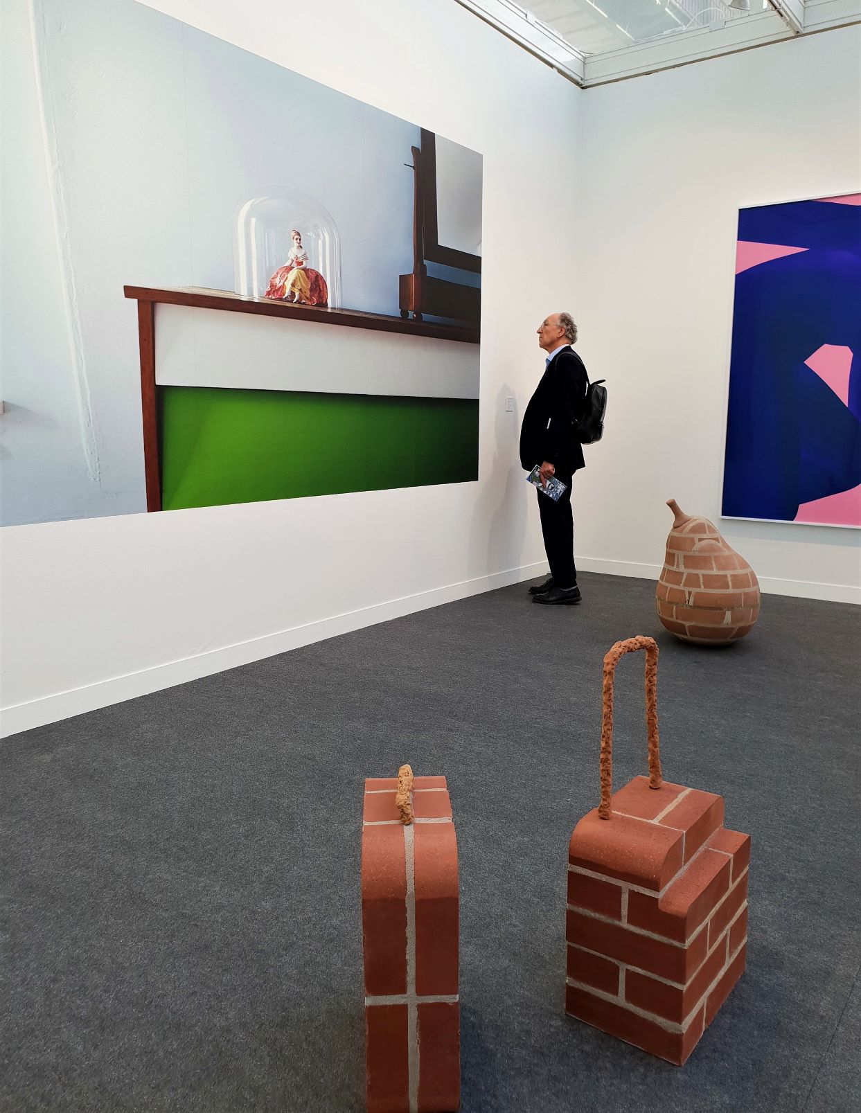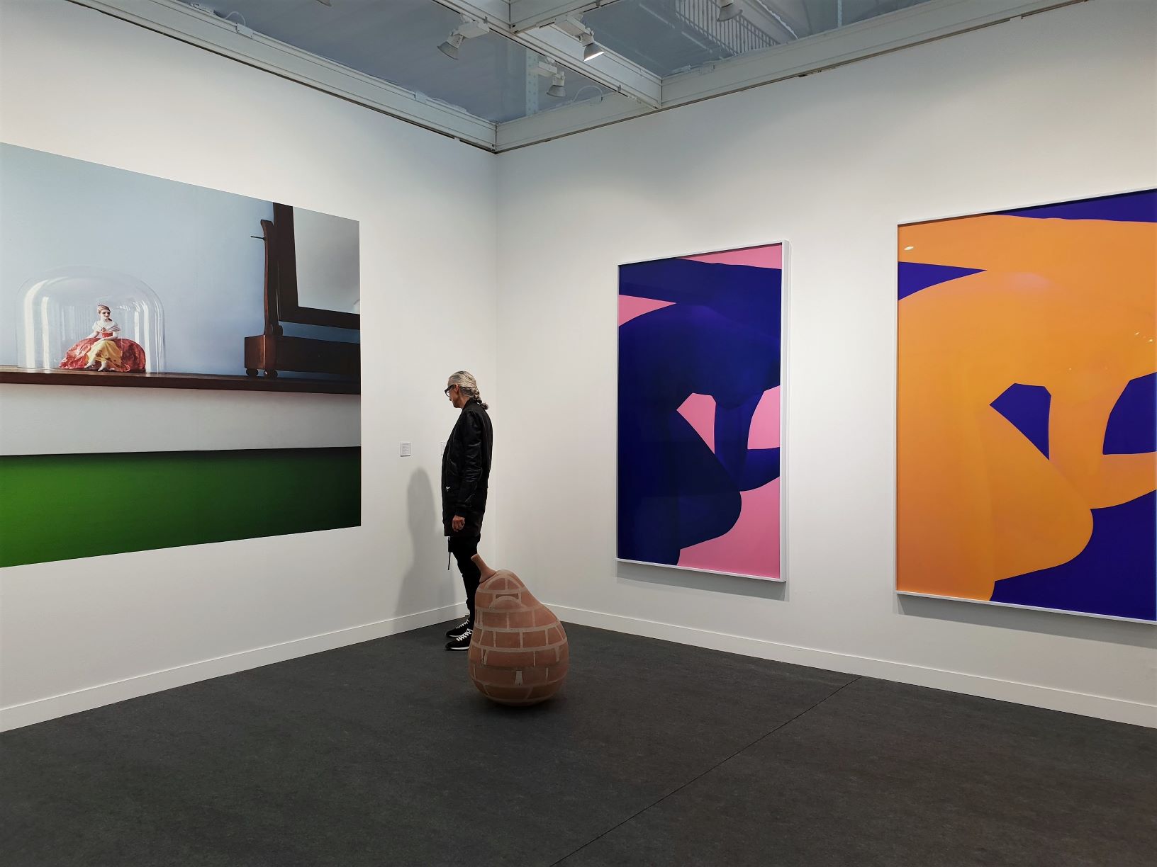 Passata Frieze, via con Fiac. Tutti al Grand Palais per la 45ª edizione della fiera d’arte moderna e contemporanea parigina, 18-21 ottobre 2018. Street painting analitico, a bande colorate, tappeto geometrico del duo Lang & Baumann per accedere (collegando il Petit e il Grand Palais sull’Avenue Churchill) all’ingresso della fiera. Una delle più riuscite installazioni delle “extra-sculture” fuori Fiac disseminate per la città, quasi sempre inutili e parecchio kitsch. Scheletro di vetro e ferro verdeggiante in questi giorni luminosissimo, vista azzurro terso, sulla scia dei 25 gradi della appena trascorsa manifestazione londinese. A Parigi, come a Londra 15 giorni fa, fa caldo. Niente vento, niente pioggia. Nessun giubbotto, nessun cappotto. Finite le giornate tra gli stand, tutti ai sempre molto radical (quanto efficaci) furgoncini street food che costeggiano il Palais verso la Senna. La fiera, molto simile alle passate edizioni (sia come artisti che come stand), si conferma anche quest’anno più curata, ordinata ed elegante della cugina d’oltremanica. Migliore. Nessun colpo di teatro (a parte il monumentale Ingres wood di Katharina Grosse piombato sotto la calotta metallica del Grand Palais da Gagosian, e lo scenografico e scintillante rosso “fuoco” di Gmurzynska -“On fire”, curato dal designer Alexandre de Betak- per scaldare l’algidità di casa) e vendite “ottime” subito dalla prima tornata (17 ottobre) dedicata a collezionisti e vip vari (si veda il secondo giorno, 18 ottobre, come già erano “trasformati” gli stand, sostituendo le opere vendute alle pareti). Progetti allestitivi in generale assai curati e gallerie italiane sugli scudi. Le 13 (su 195, da 27 paesi) realtà nostrane sono sicuramente tra i punti più positivi della fiera.