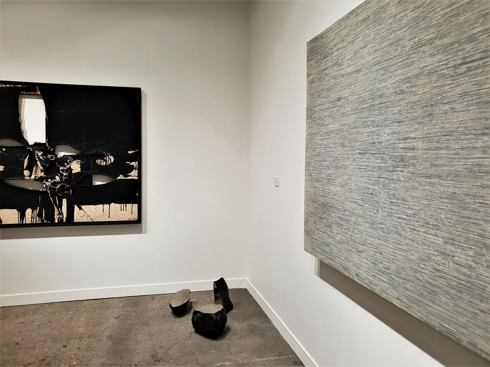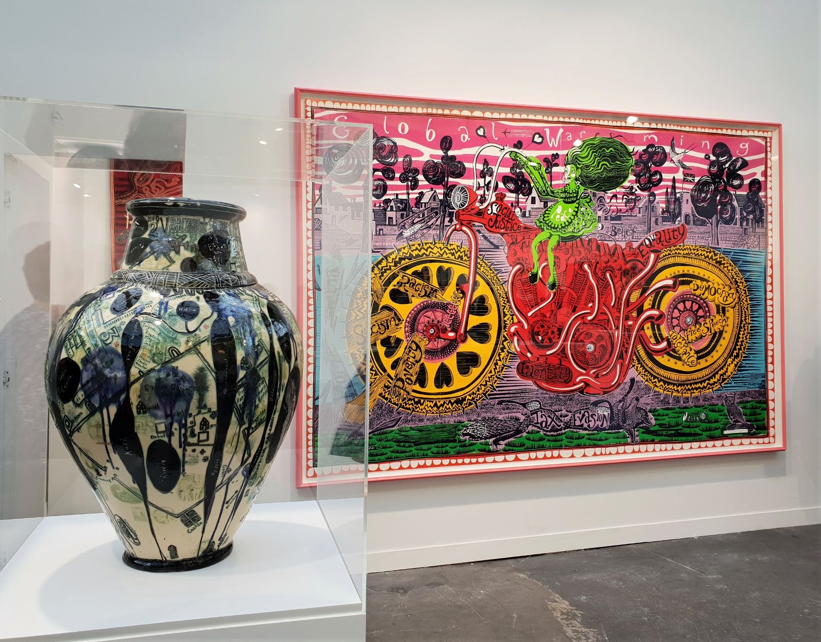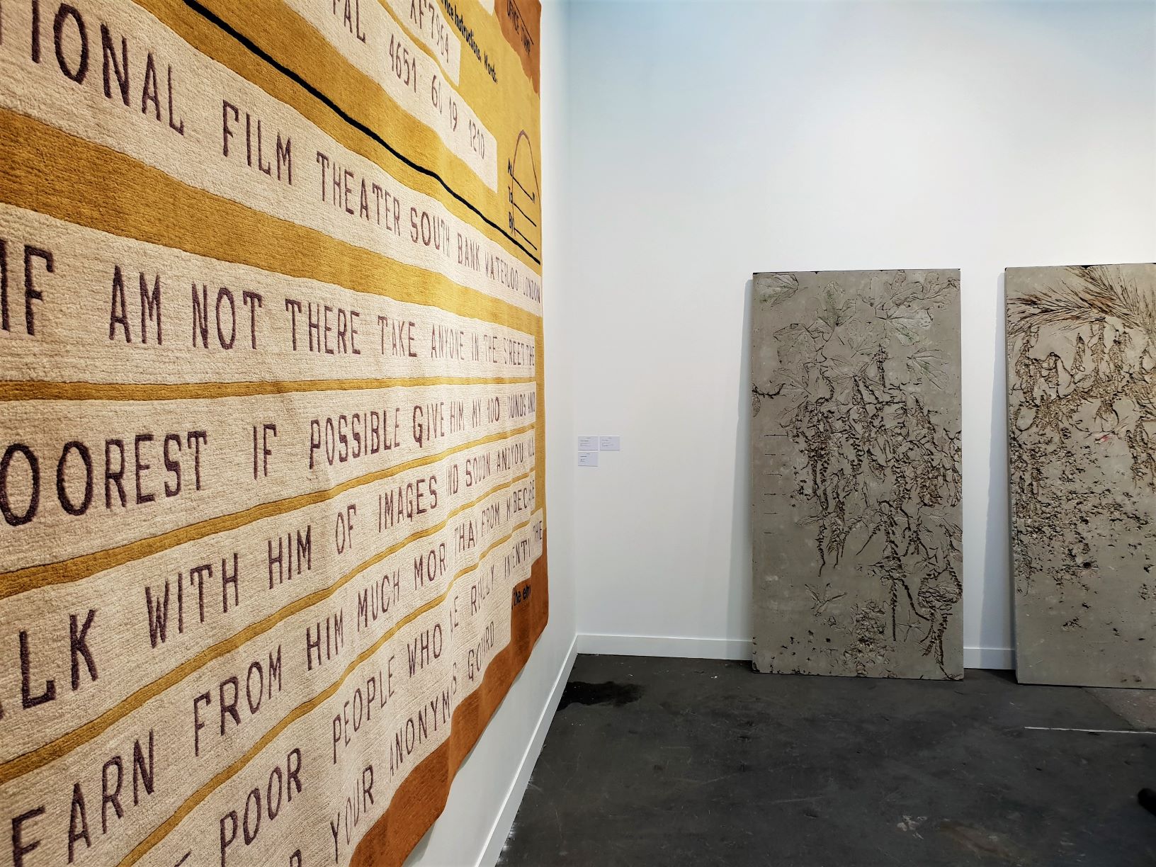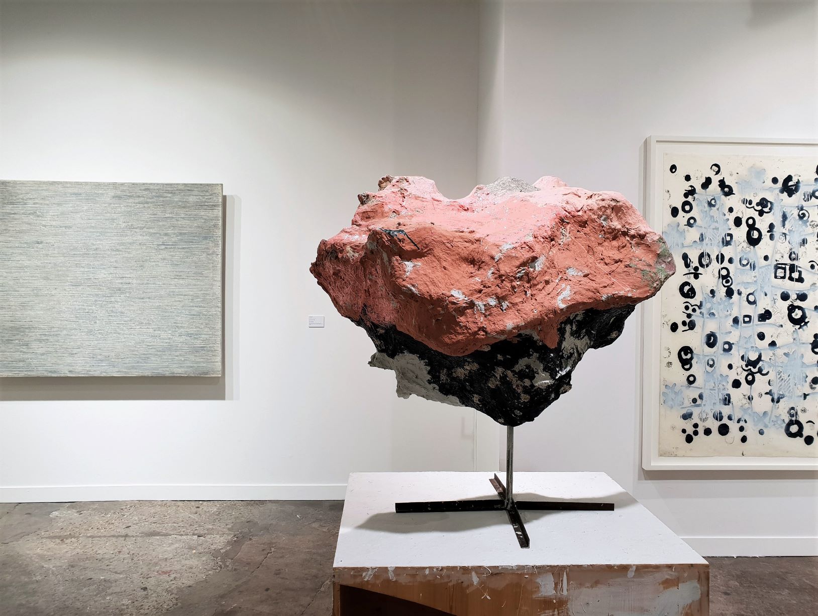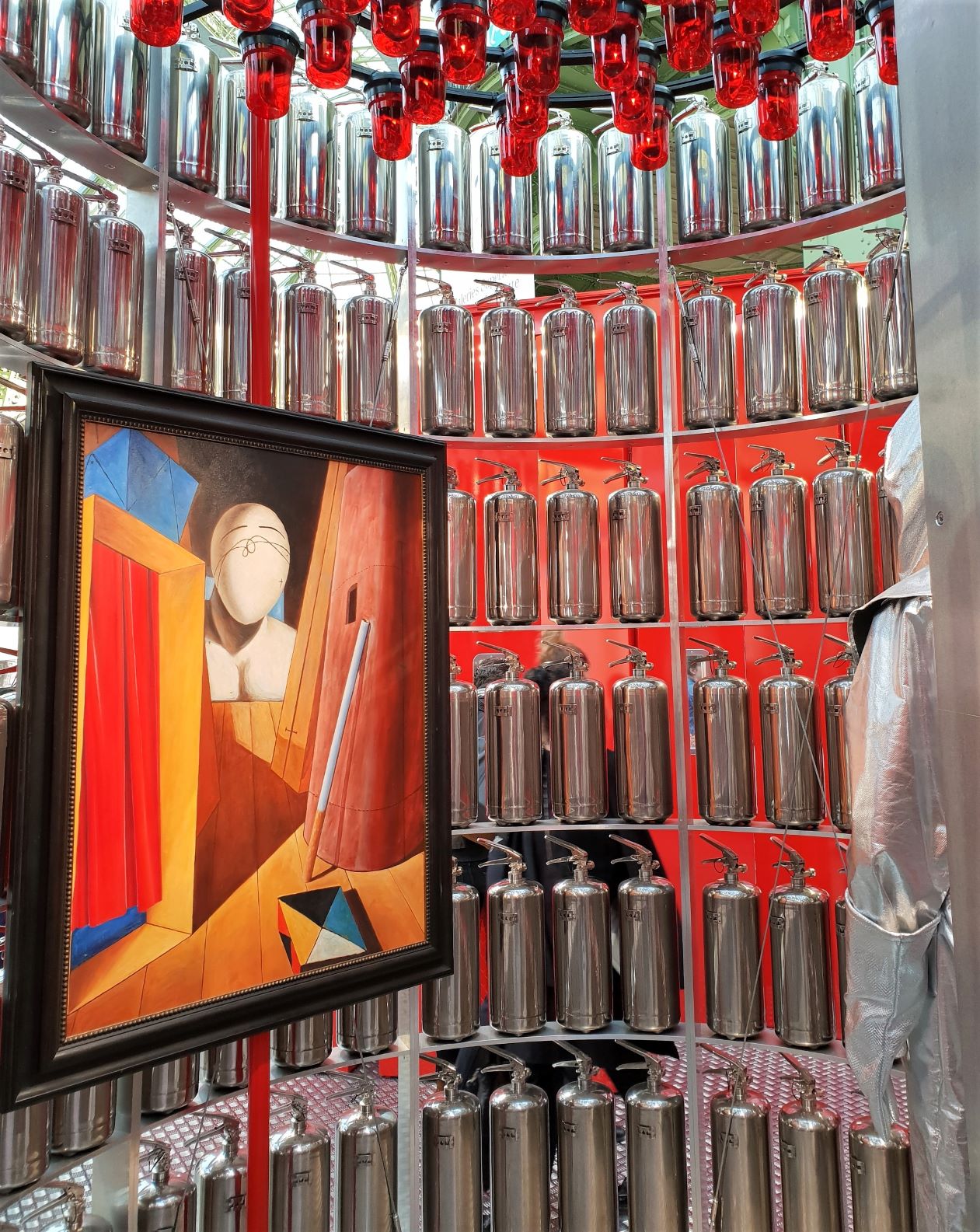 Passata Frieze, via con Fiac. Tutti al Grand Palais per la 45ª edizione della fiera d’arte moderna e contemporanea parigina, 18-21 ottobre 2018. Street painting analitico, a bande colorate, tappeto geometrico del duo Lang & Baumann per accedere (collegando il Petit e il Grand Palais sull’Avenue Churchill) all’ingresso della fiera. Una delle più riuscite installazioni delle “extra-sculture” fuori Fiac disseminate per la città, quasi sempre inutili e parecchio kitsch. Scheletro di vetro e ferro verdeggiante in questi giorni luminosissimo, vista azzurro terso, sulla scia dei 25 gradi della appena trascorsa manifestazione londinese. A Parigi, come a Londra 15 giorni fa, fa caldo. Niente vento, niente pioggia. Nessun giubbotto, nessun cappotto. Finite le giornate tra gli stand, tutti ai sempre molto radical (quanto efficaci) furgoncini street food che costeggiano il Palais verso la Senna. La fiera, molto simile alle passate edizioni (sia come artisti che come stand), si conferma anche quest’anno più curata, ordinata ed elegante della cugina d’oltremanica. Migliore. Nessun colpo di teatro (a parte il monumentale Ingres wood di Katharina Grosse piombato sotto la calotta metallica del Grand Palais da Gagosian, e lo scenografico e scintillante rosso “fuoco” di Gmurzynska -“On fire”, curato dal designer Alexandre de Betak- per scaldare l’algidità di casa) e vendite “ottime” subito dalla prima tornata (17 ottobre) dedicata a collezionisti e vip vari (si veda il secondo giorno, 18 ottobre, come già erano “trasformati” gli stand, sostituendo le opere vendute alle pareti). Progetti allestitivi in generale assai curati e gallerie italiane sugli scudi. Le 13 (su 195, da 27 paesi) realtà nostrane sono sicuramente tra i punti più positivi della fiera.