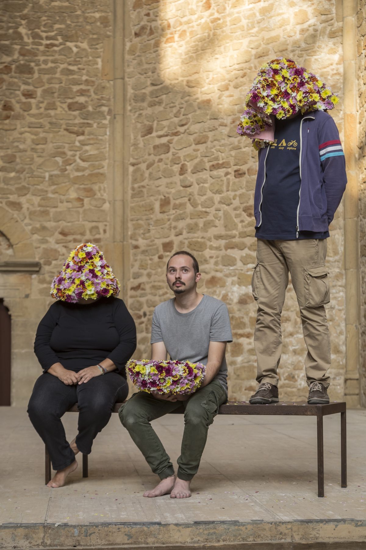 Qualche minuto prima delle 17:00 non viene fatto più entrare nessuno nella sala per prepararsi, le spiegazioni sono finite ora si deve agire. Ognuno di noi prende, con religioso silenzio, il proprio segno fiorito: il fiore diventa quell’arma che Vinci e Galesi hanno scelto per indurre a riflettere su quanto siano importanti e incisive le azioni di ogni singola persona all’interno di una società. La musica ritmica e cosmica comincia a risuonare nell’abside. Dalla mia posizione, in piedi su una panca di ferro, con un casco di fiori che copre il mio volto cerco di sbirciare cosa accade. Lentamente entrano i fruitori, in silenzio, indicano il palco, aspettano un gesto, uno sguardo. I miei compagni di avventura muovono lentamente una mano sui fianchi, una gamba verso il gradino, un barbuto signore protegge un bastone di fiori che altro non è che l’asse del mondo. I miei vicini di panca, entrambe seduti con i piedi nudi, come a cercare un contatto con la terra, si guardano, portano con gioia una coppa di fiori e un cappello a punta che si alza come una montagna. Muovo la mia testa coperta di fiori verso destra per cercare lo sguardo dei visitatori per guidarli verso il mio compagno al centro della scena che indossa una tunica di fiori, i suoi occhi profondi catturano l’attenzione. Vorrei far vedere quanto sia bello un mondo fiorito.