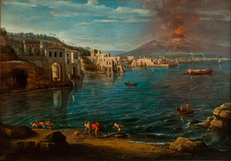 Veduta di Napoli da Posillipo con Vesuvio in eruzione
