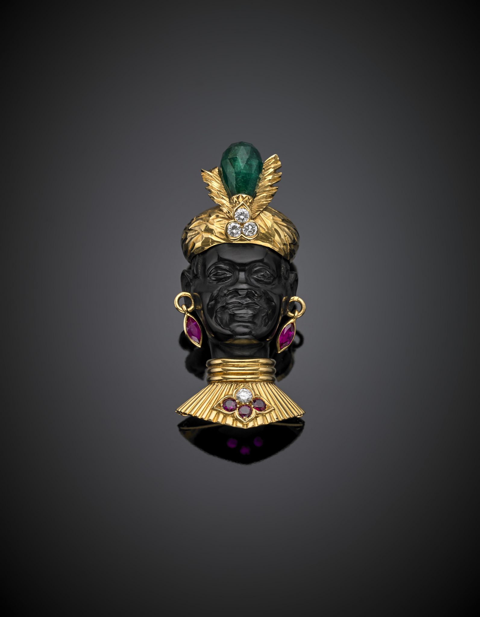 Broche in oro giallo a guisa di moretto con pennacchio a goccia in smeraldo, rifinita con rubini e diamanti, g 22,45, lungh. cm 5,30 circa. Firmata Cartier Paris, Deposé SSM 11794 e 020000.